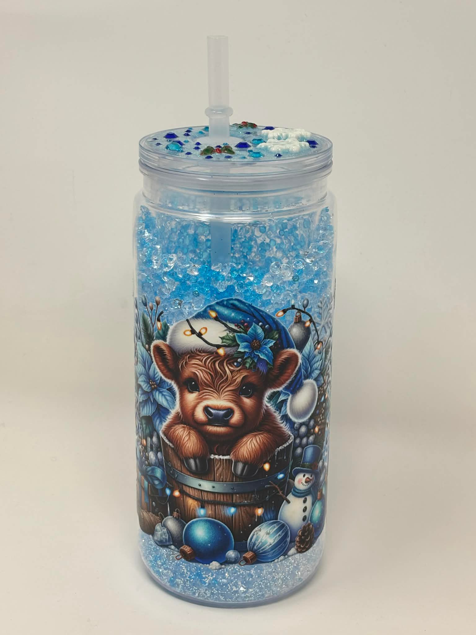 Cuteness overload! The Cozy Moo Snowglobe Tumbler features an irresistibly sweet Highland cow bundled up for winter, surrounded by frosty blue florals, Christmas lights, ornaments, and a friendly little snowman. It’s the ultimate mix of rustic charm and winter magic!