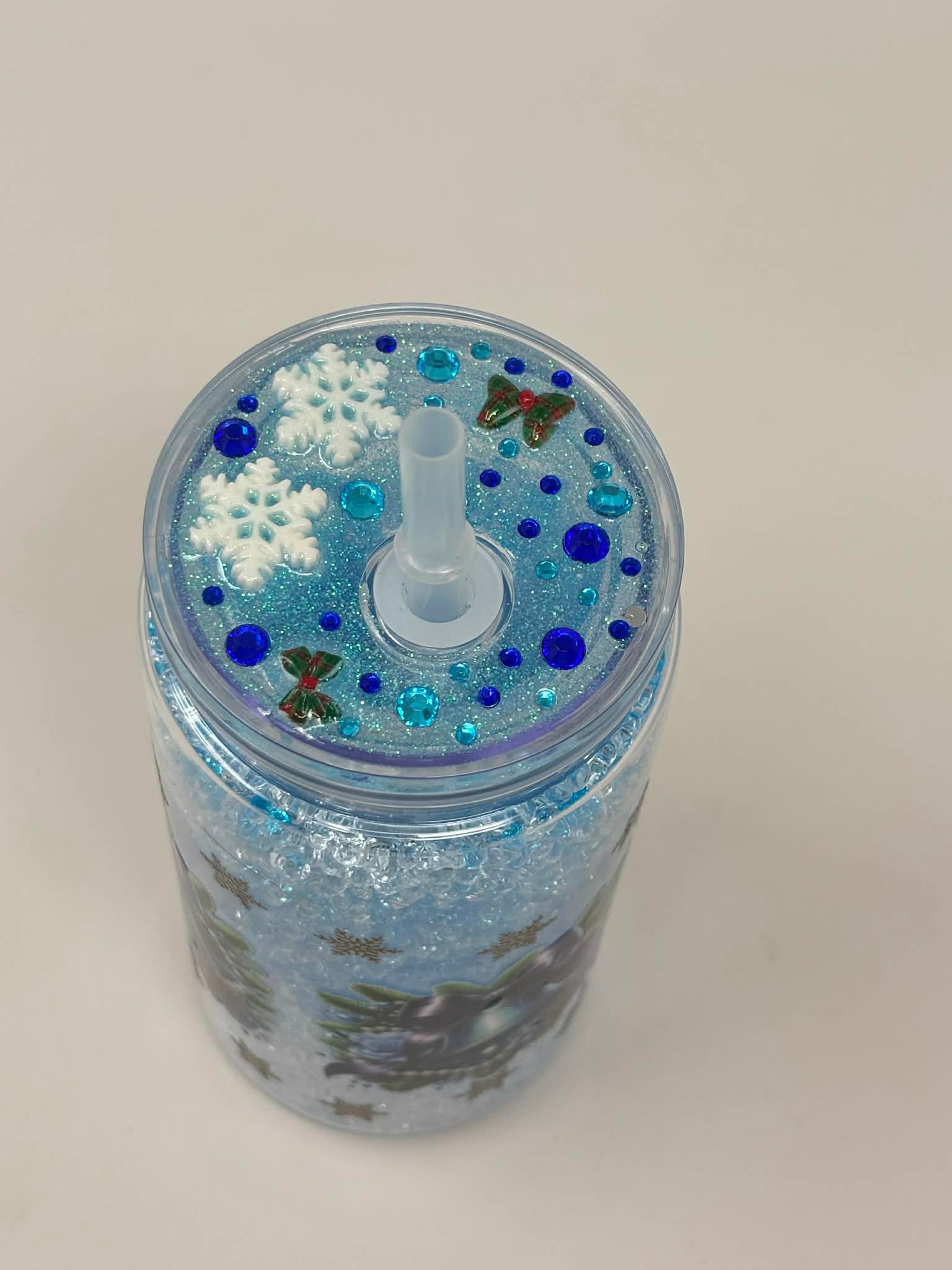 This glass tumbler is filled with icy blue snowglobe beads that shimmer and move as you sip — making every drink a mini snowstorm in your hand. The lid sparkles with snowy glitter and icy gem accents, topped with a clear straw to complete the look.
