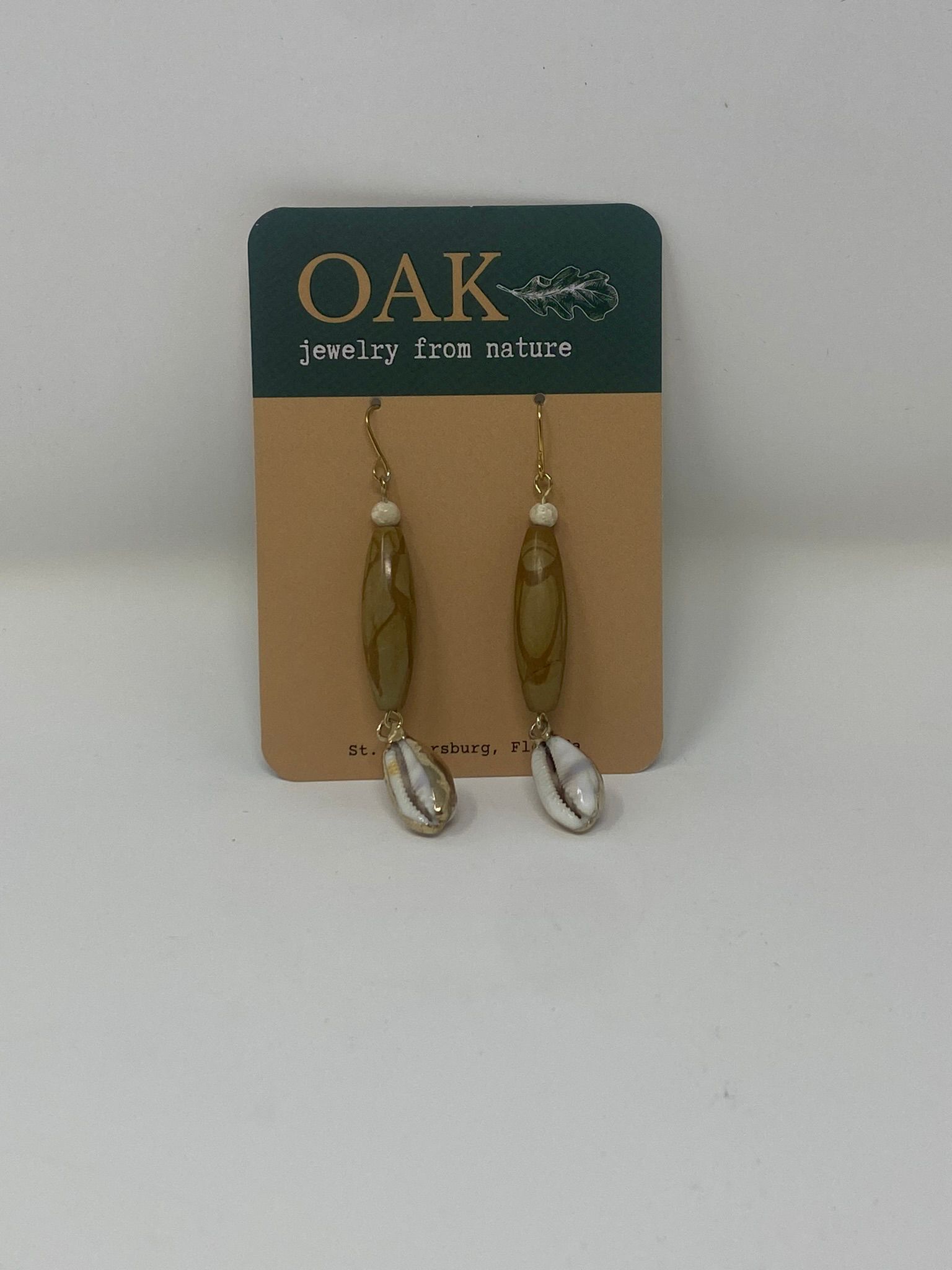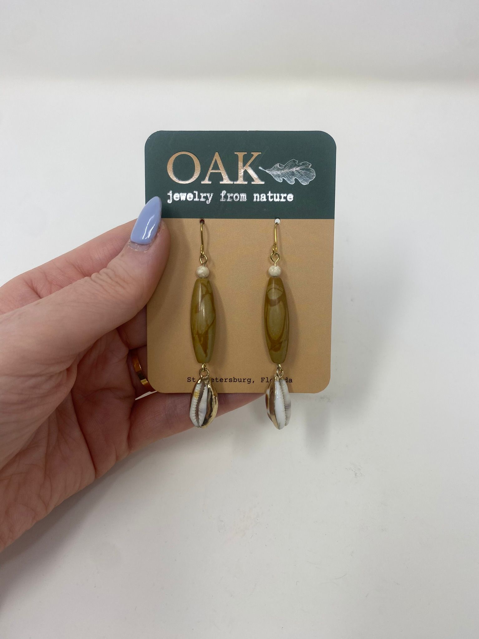These naturally grounded and beautifully wild dangle earrings feature elongated olive-toned stones topped with creamy beads and finished with natural cowrie shell drops. Inspired by driftwood washed ashore, they echo a life lived by the tide and touched by the forest. Handcrafted with organic textures & calming tones, using ethically sourced real shell accents they are a perfect match for sundresses, salt air, and slow mornings.