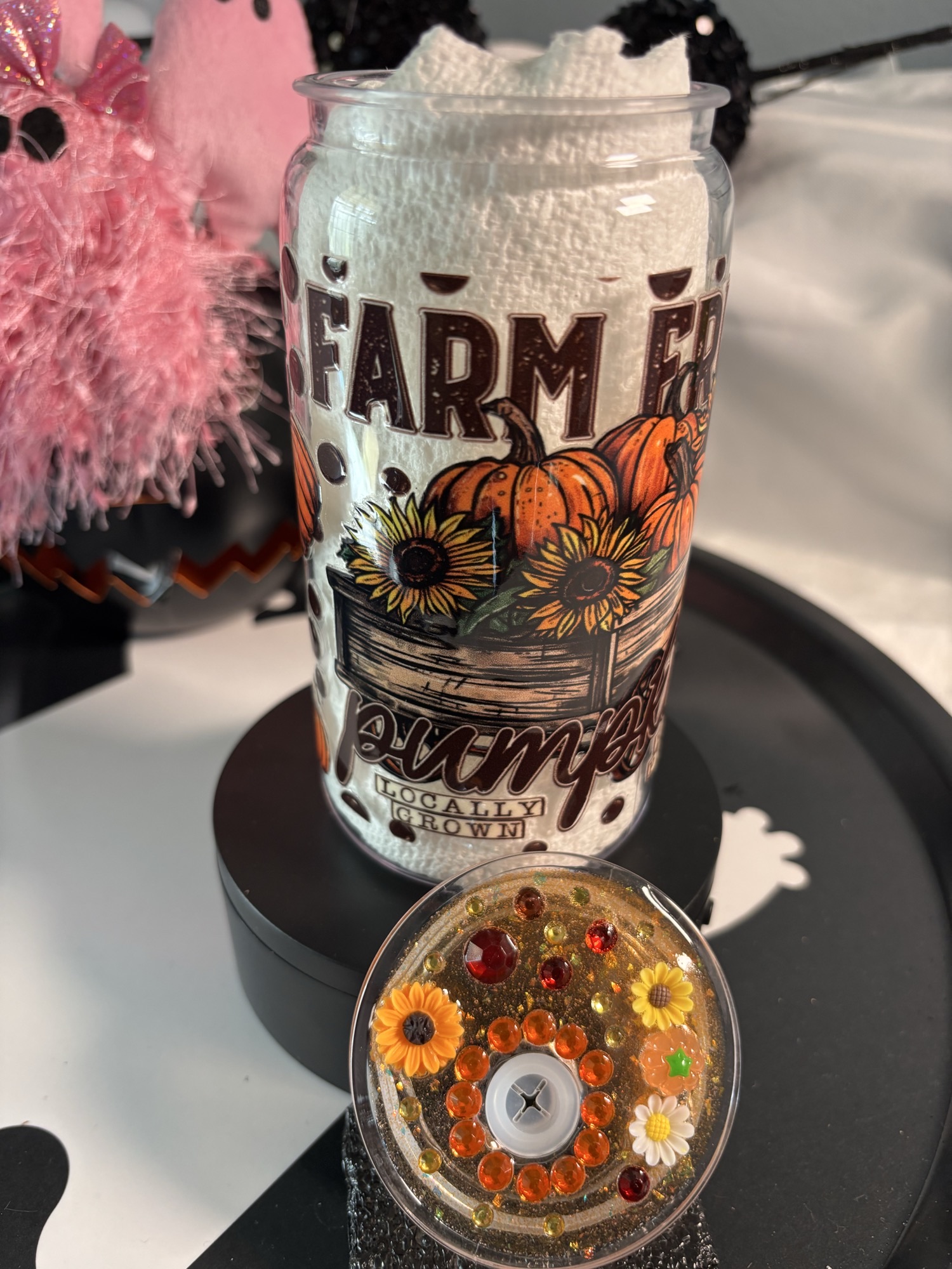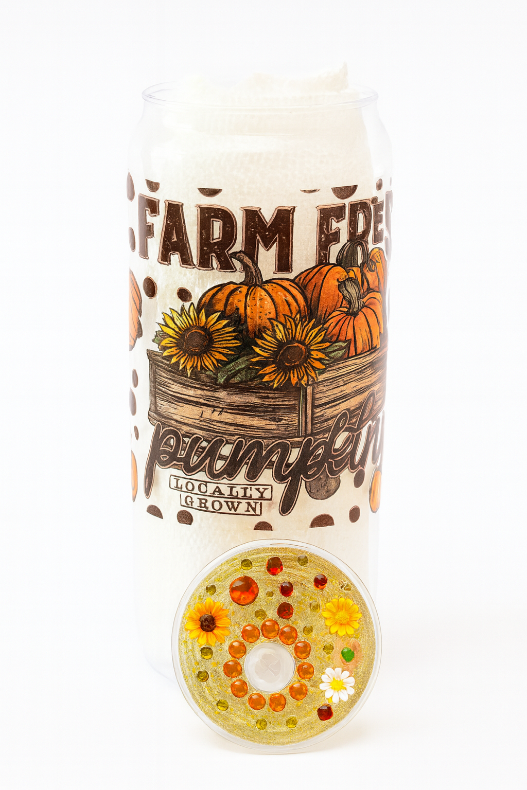 Bring the charm of the pumpkin patch wherever you go with the Farm Fresh Pumpkin tumbler. Featuring rustic farmhouse lettering, a crate of bright orange pumpkins, and cheerful sunflowers, this tumbler captures the heart of autumn days spent outdoors.