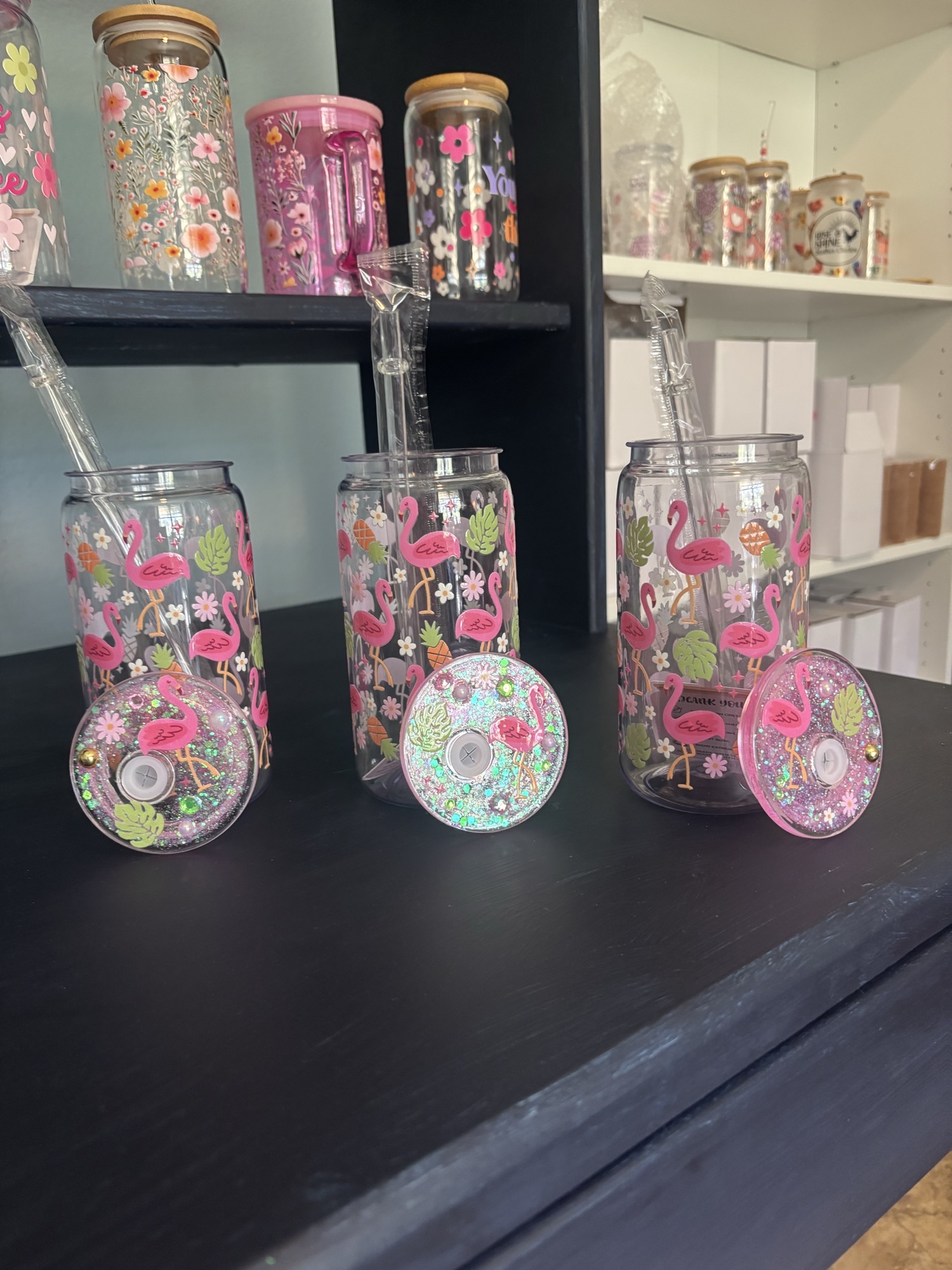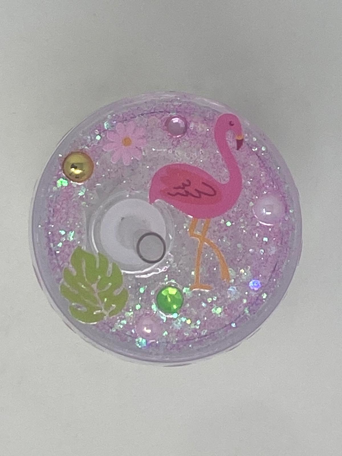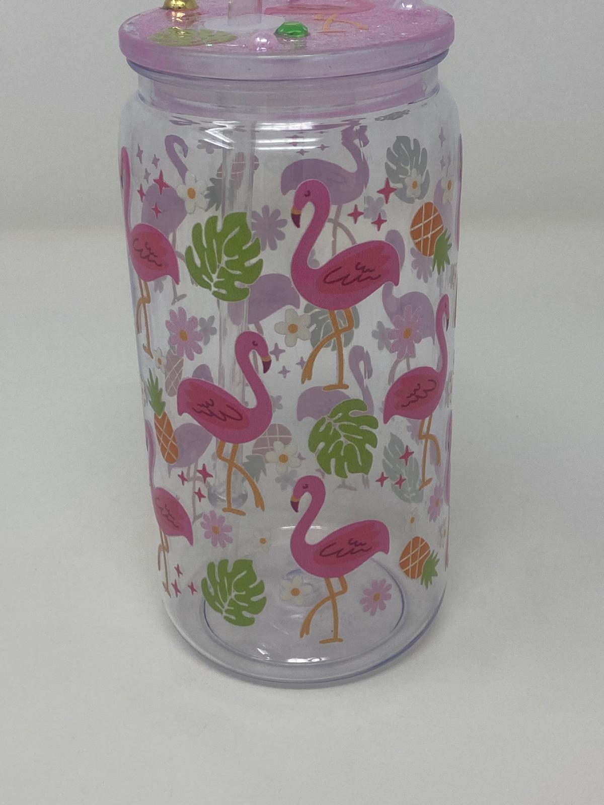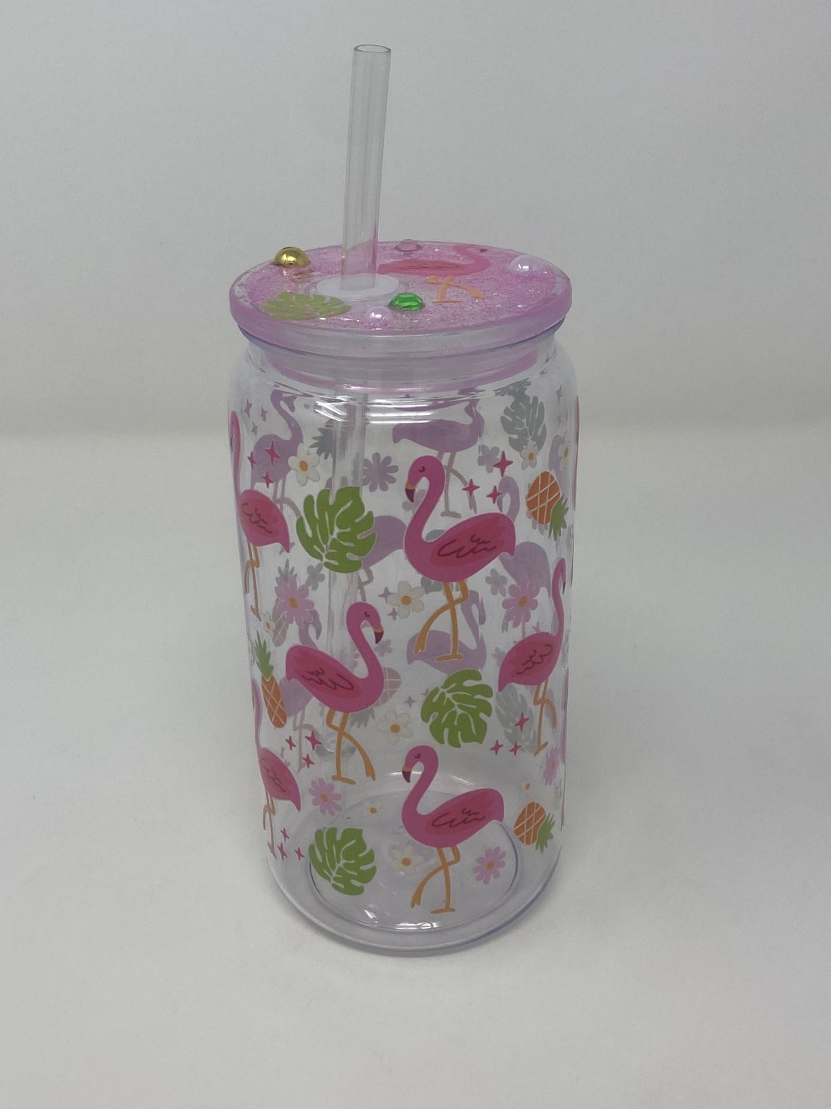 Bring the beach party vibes wherever you go with the Flamingo Fizz tumbler. Featuring a parade of pretty pink flamingos dancing among tropical leaves and blooms, this plastic cup is topped with a glittery lid and matching straw for a dash of sparkle in every sip.