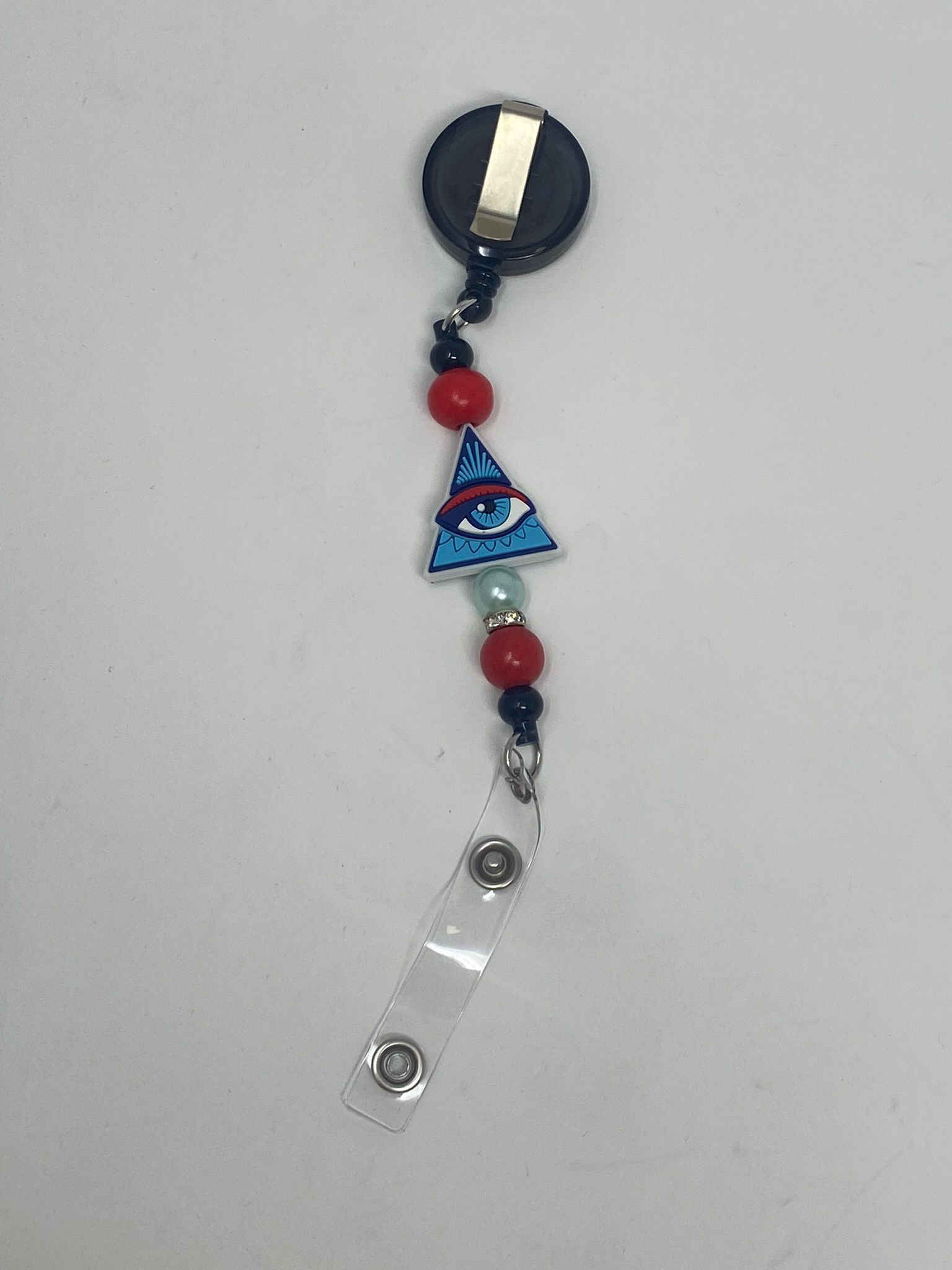 For the boss, the observer, the one who sees everything. This handmade badge reel features a bold pyramid eye charm, sleek black clip, and red & aqua accents that keep your look sharp and your energy sharper.