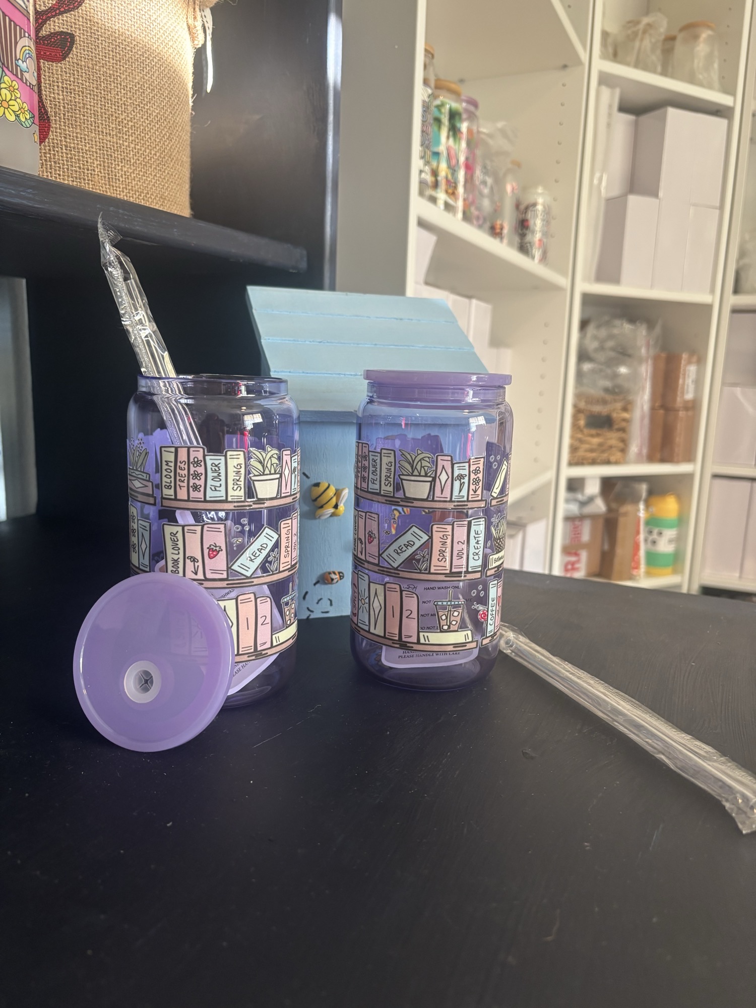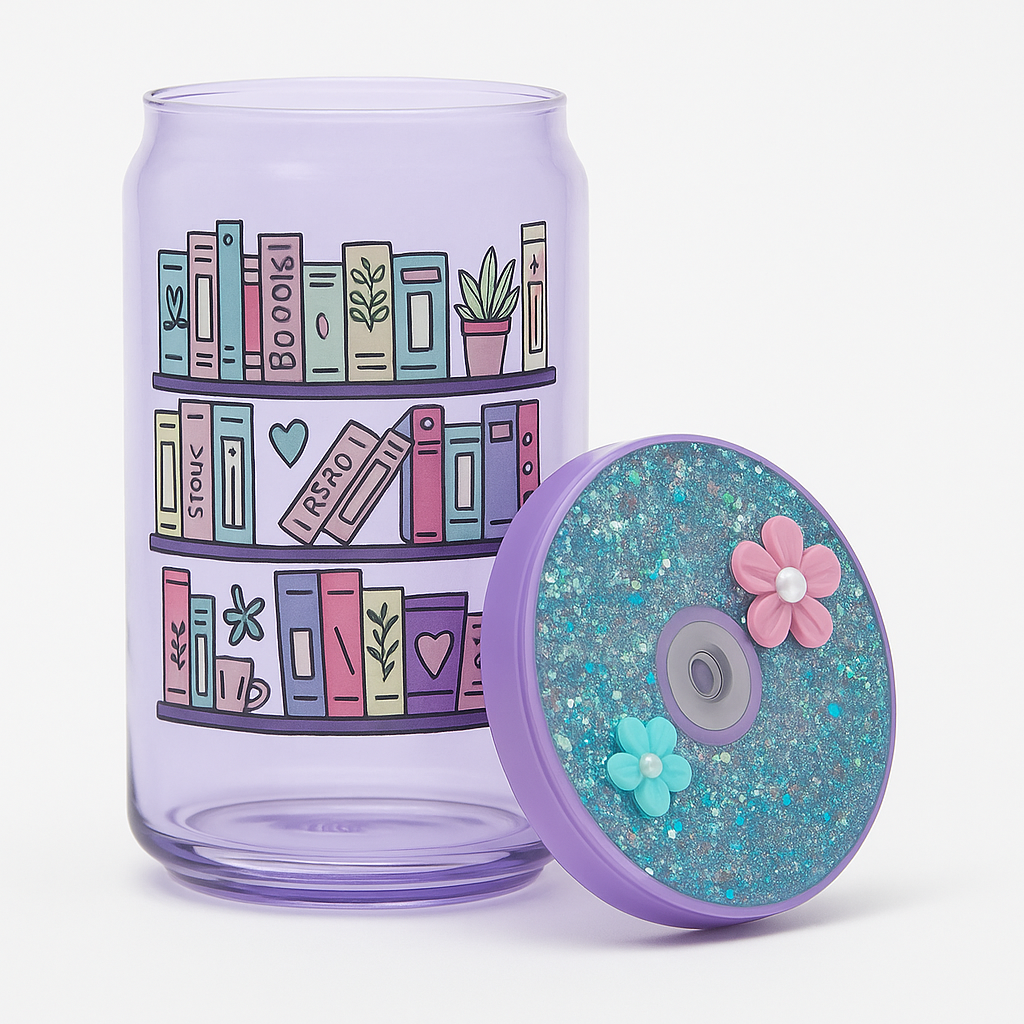 This gorgeous lavender glass tumbler features a charming illustrated bookshelf packed with colorful reads, greenery, and heartwarming details. The shimmering glitter lid is topped with dainty floral embellishments, adding a sweet sparkle to your sips.