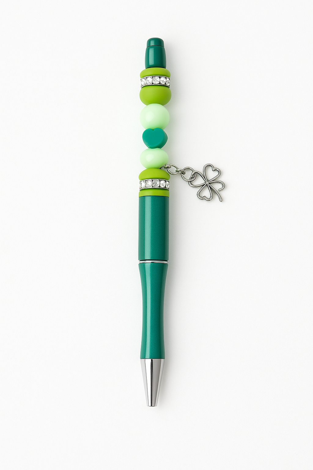 Bright, breezy, and full of good fortune — this handmade pen brings lucky vibes with its emerald green barrel, shimmer-dusted beads, a touch of rhinestone sparkle, and a dangling four-leaf clover charm. Made with love by Willow of Holistic Hippie Vibes in Florida!
