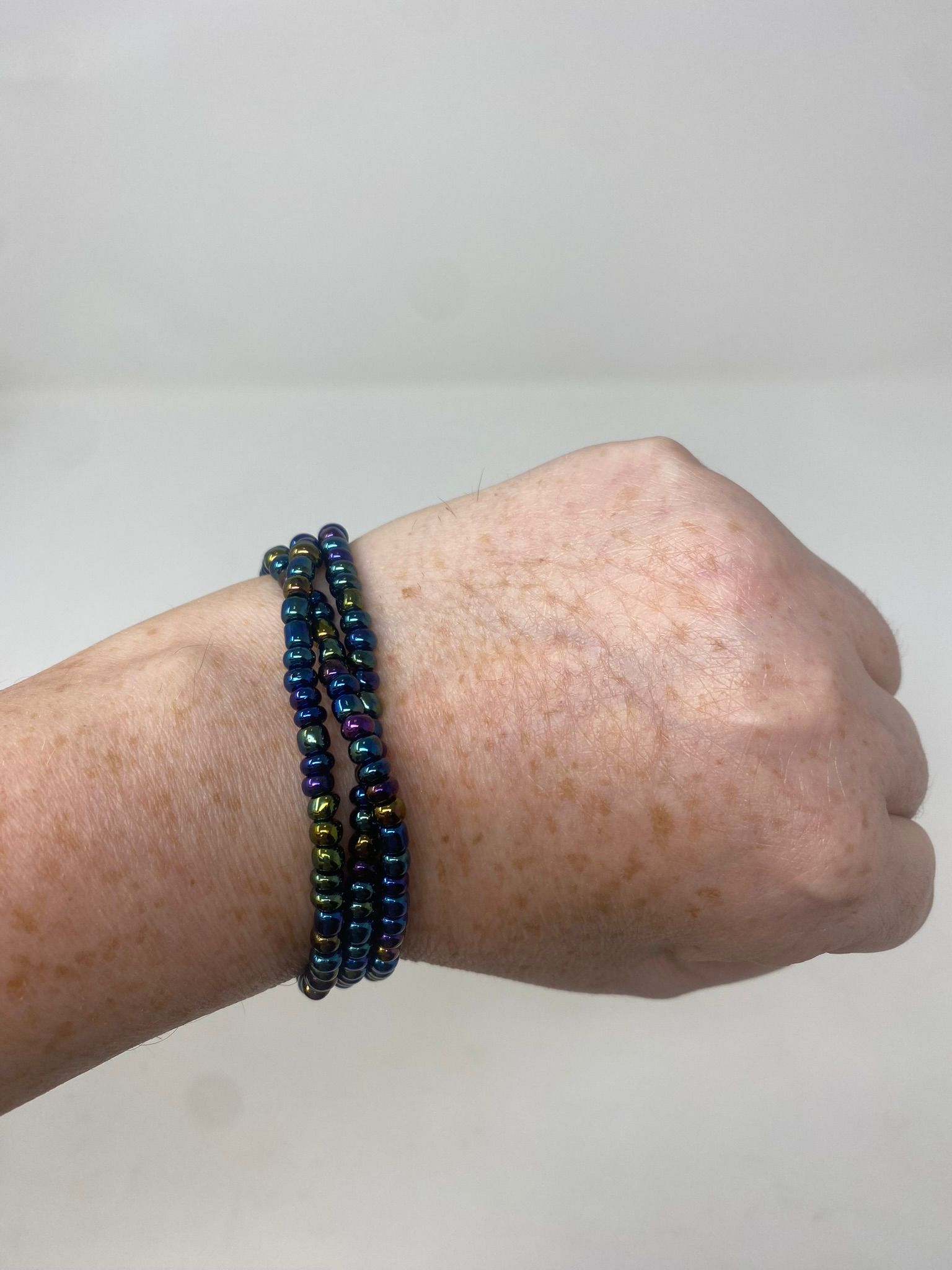 Elegant and effortless, the Moonlit Current Bracelet features three strands of high-quality, iridescent seed beads that reflect every shade of twilight: sapphire, teal, plum, and gold. Designed and handmade in Florida, this piece brings together coastal vibes and cosmic shimmer in one lightweight, layered accessory.