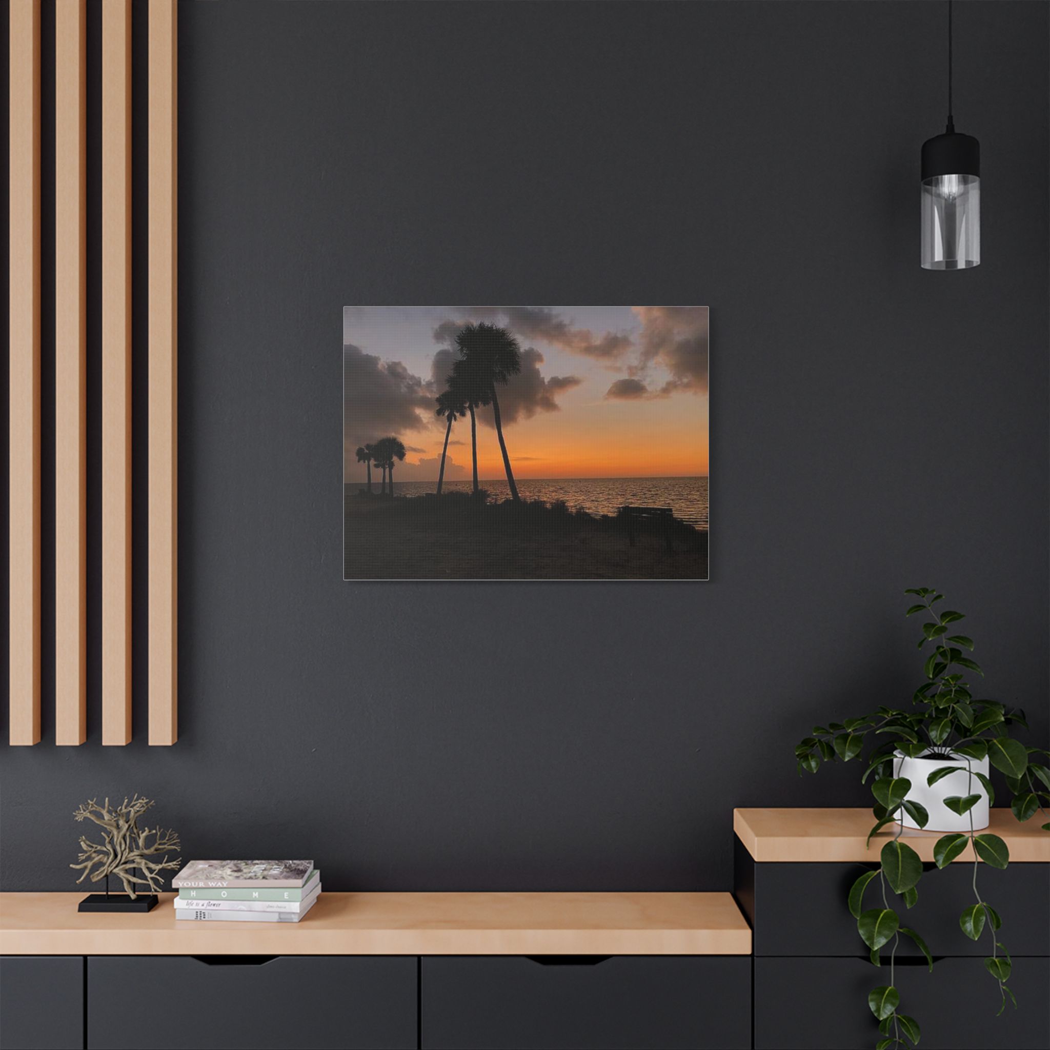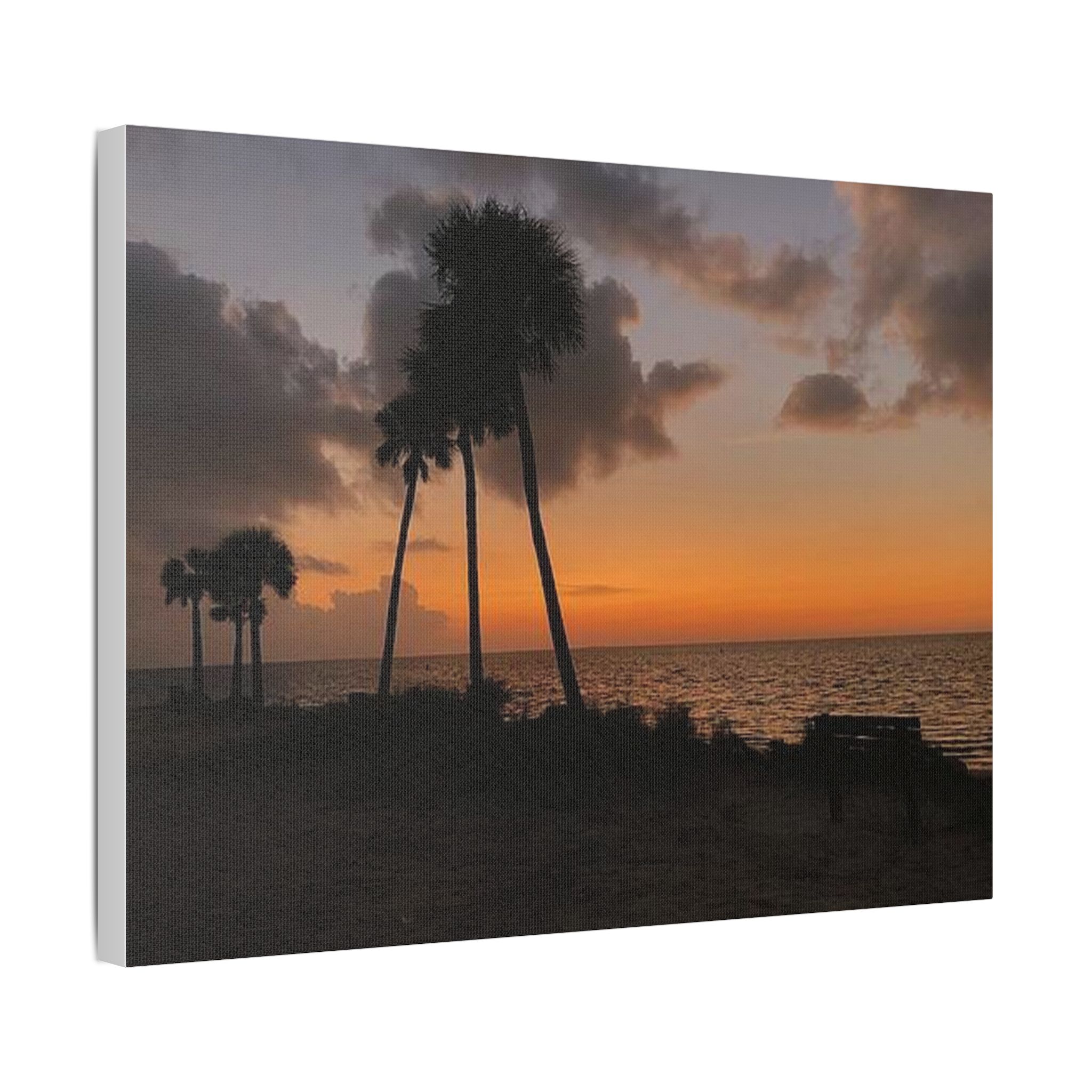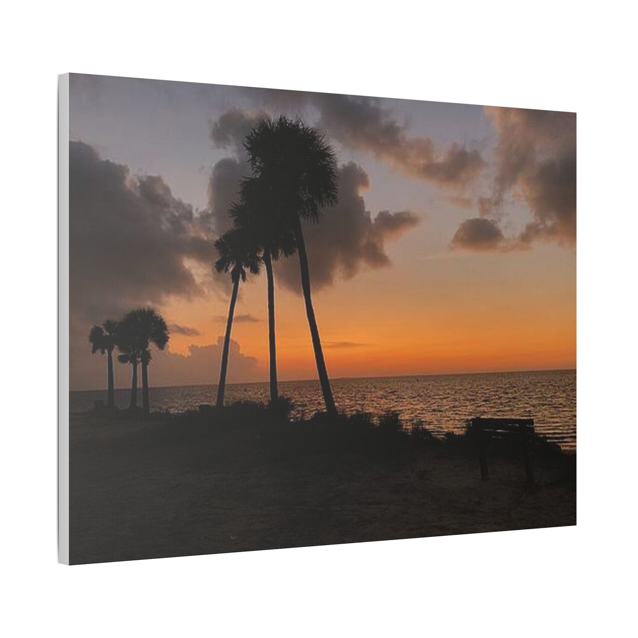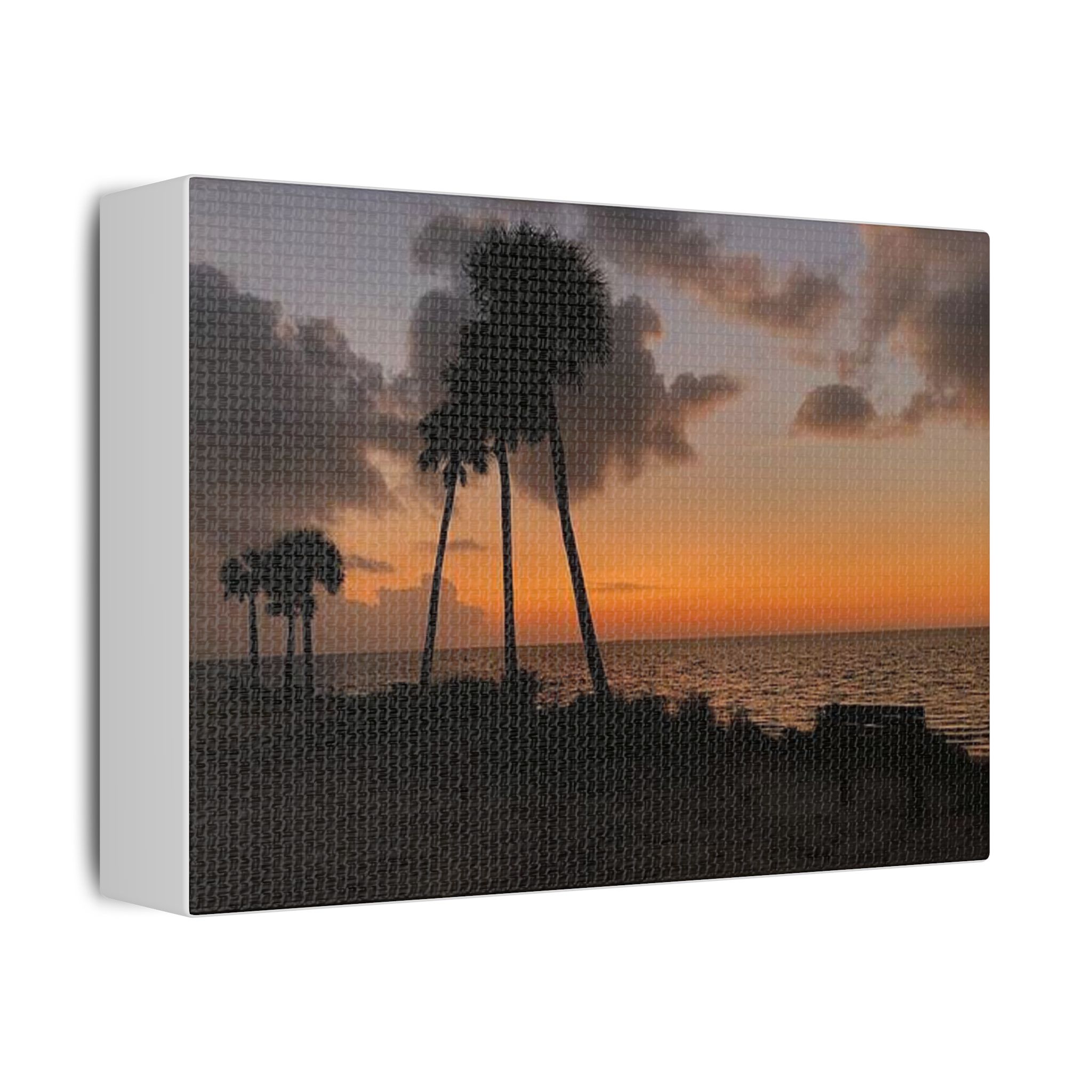 Palm Pause by Hmh Art captures the serene hush of a Florida evening just as the sun kisses the horizon. Silhouetted palms lean gently toward calm Gulf waters, while an empty bench invites you to sit, breathe, and simply be. Printed on premium satin canvas and crafted in the USA, this piece blends warmth and wanderlust—bringing effortless coastal beauty into any space. A tribute to golden hour and the art of doing nothing.
