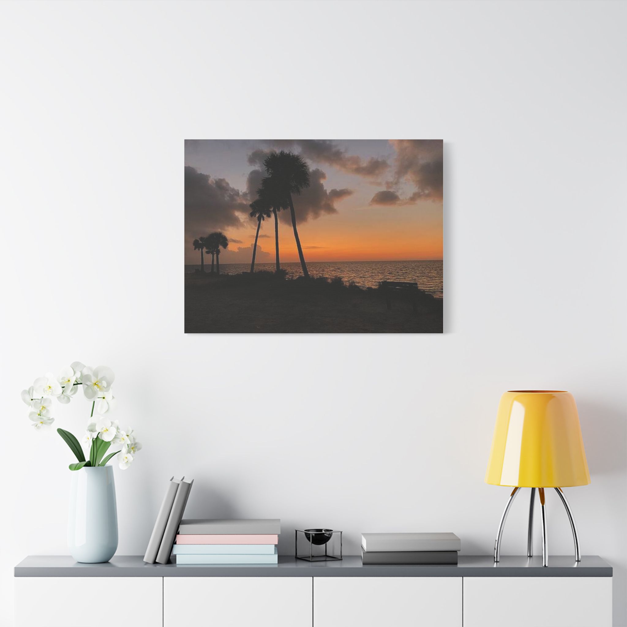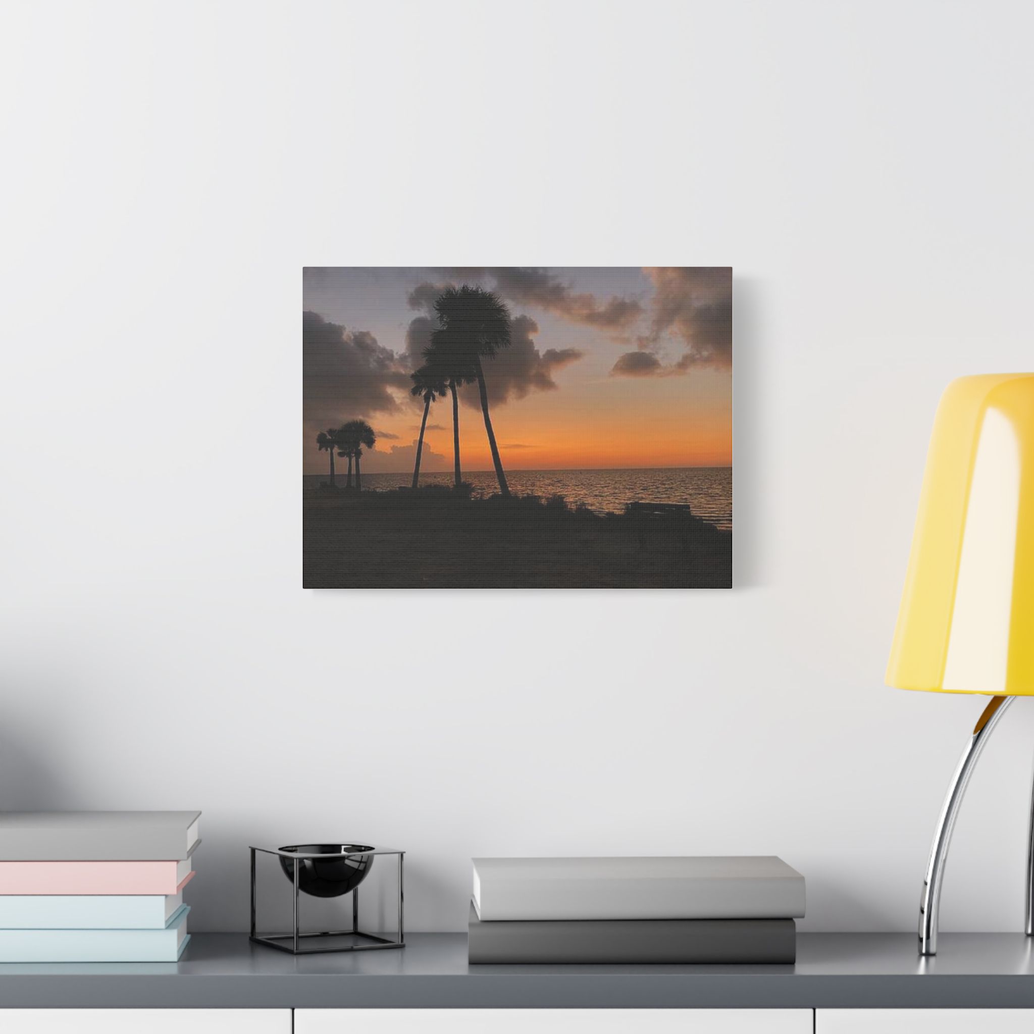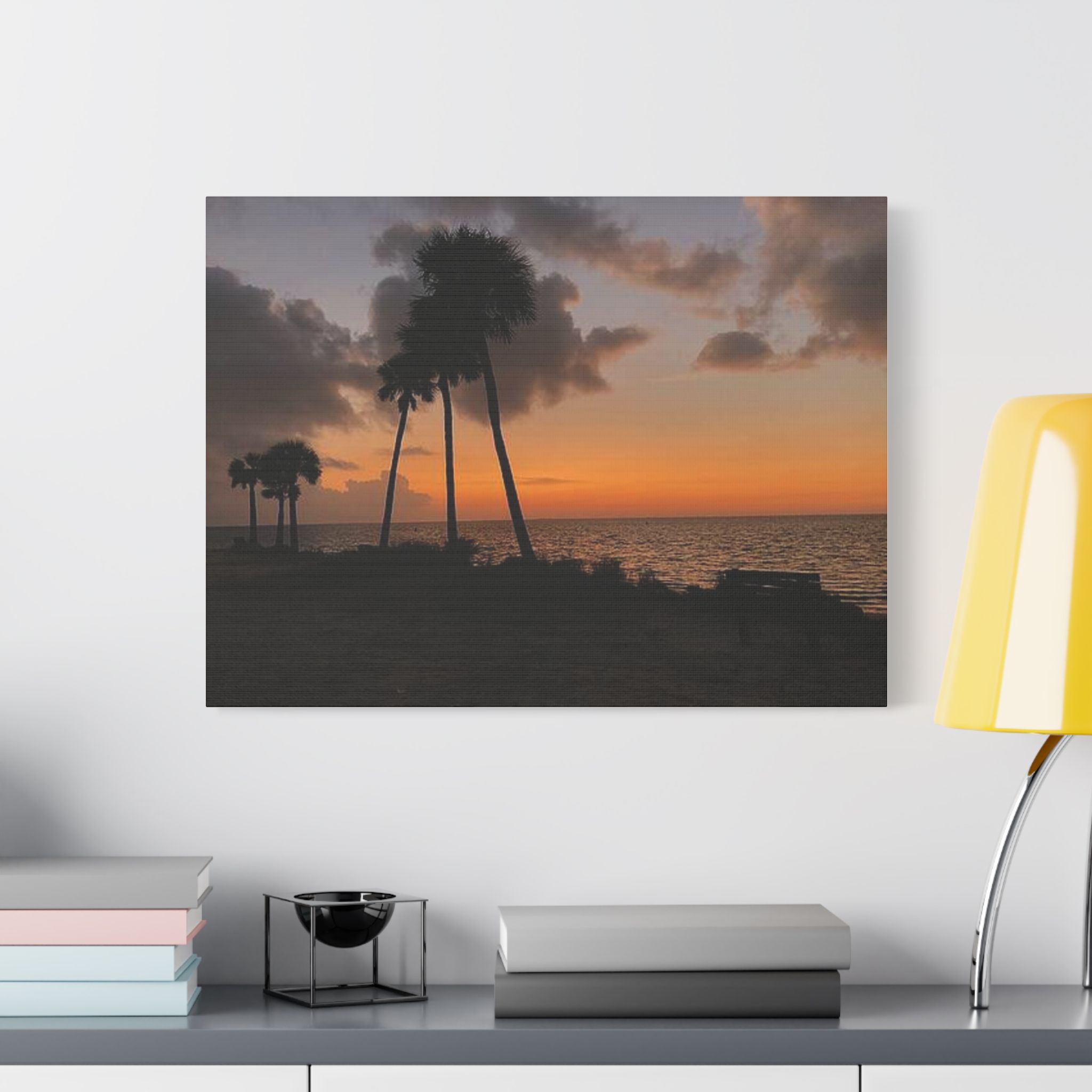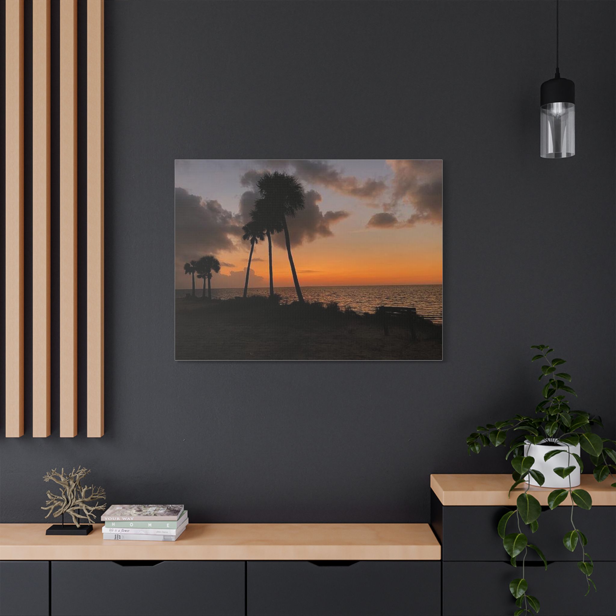 Palm Pause by Hmh Art captures the serene hush of a Florida evening just as the sun kisses the horizon. Silhouetted palms lean gently toward calm Gulf waters, while an empty bench invites you to sit, breathe, and simply be. Printed on premium satin canvas and crafted in the USA, this piece blends warmth and wanderlust—bringing effortless coastal beauty into any space. A tribute to golden hour and the art of doing nothing.