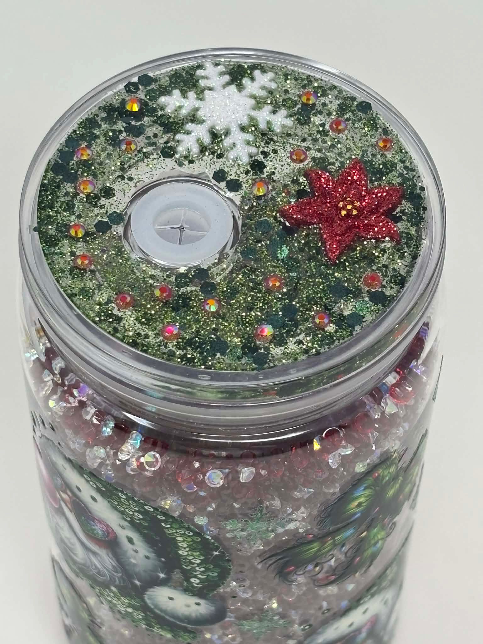 Made from high-quality glass, this tumbler is filled with sparkly faux snow crystals that move like a snowglobe when shaken. The festive lid is topped with glitter, a bold red poinsettia, rhinestones, and a frosted snowflake for the ultimate winter vibe.