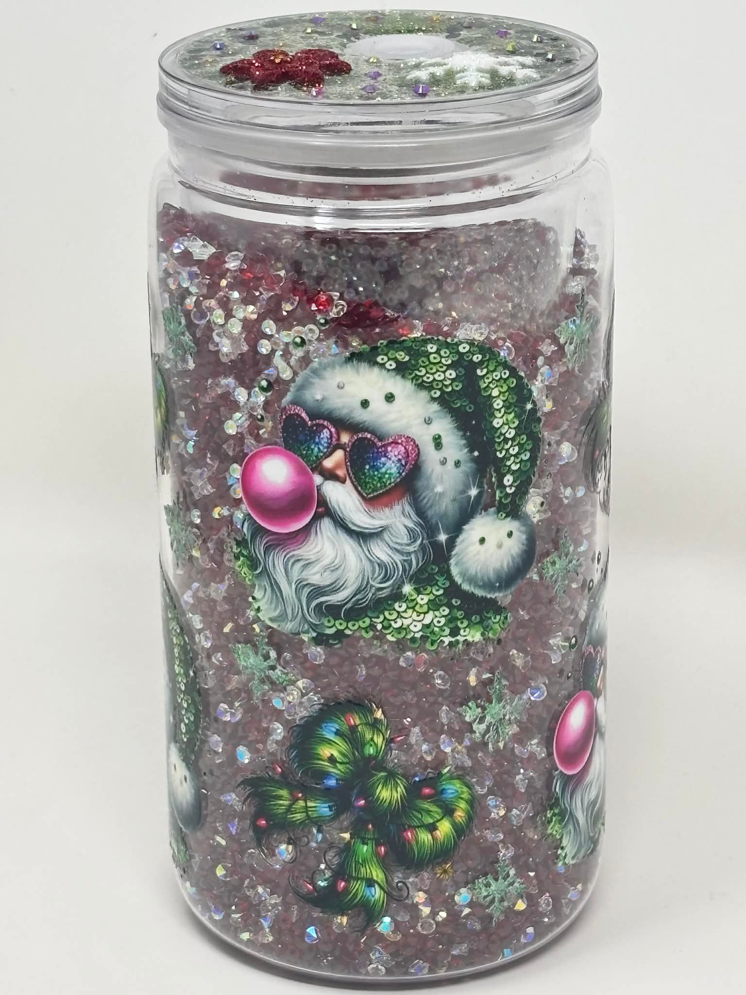 Bring the magic of a snowglobe to your daily drink with the dazzling Santa Sparkle Snowglobe Tumbler! This limited-edition holiday tumbler features a sassy Santa blowing bubblegum, dressed in shimmering sequins and heart-shaped sunglasses — because this Santa slays.