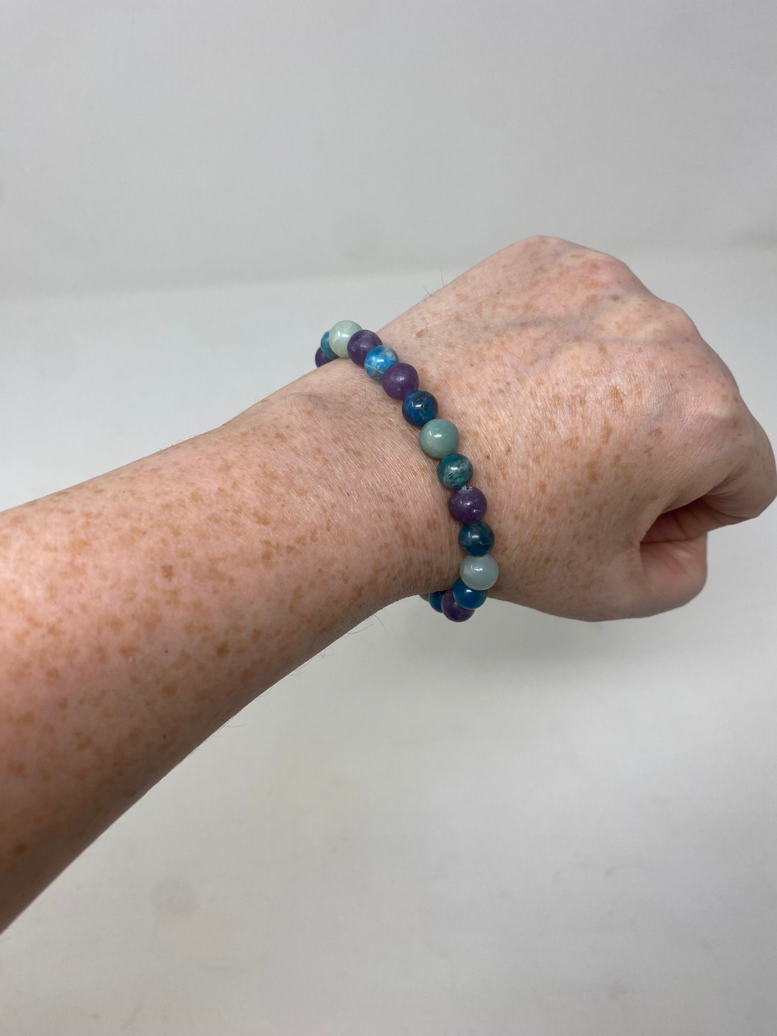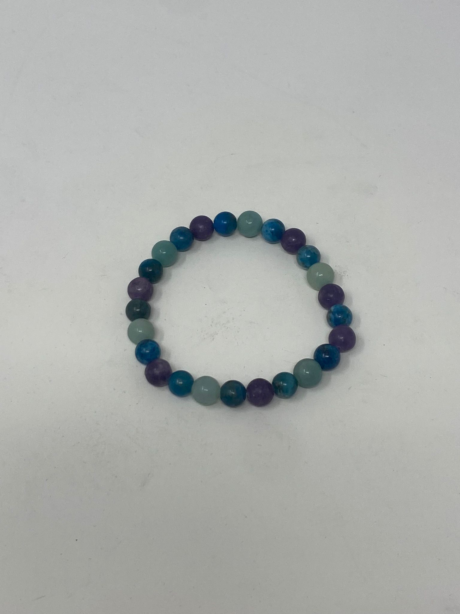 Channel oceanic calm and celestial color with the Seaside Aura Bracelet, a handmade gemstone bracelet crafted in Florida using high-quality natural beads in rich tones of aqua, amethyst, and deep sea blue.