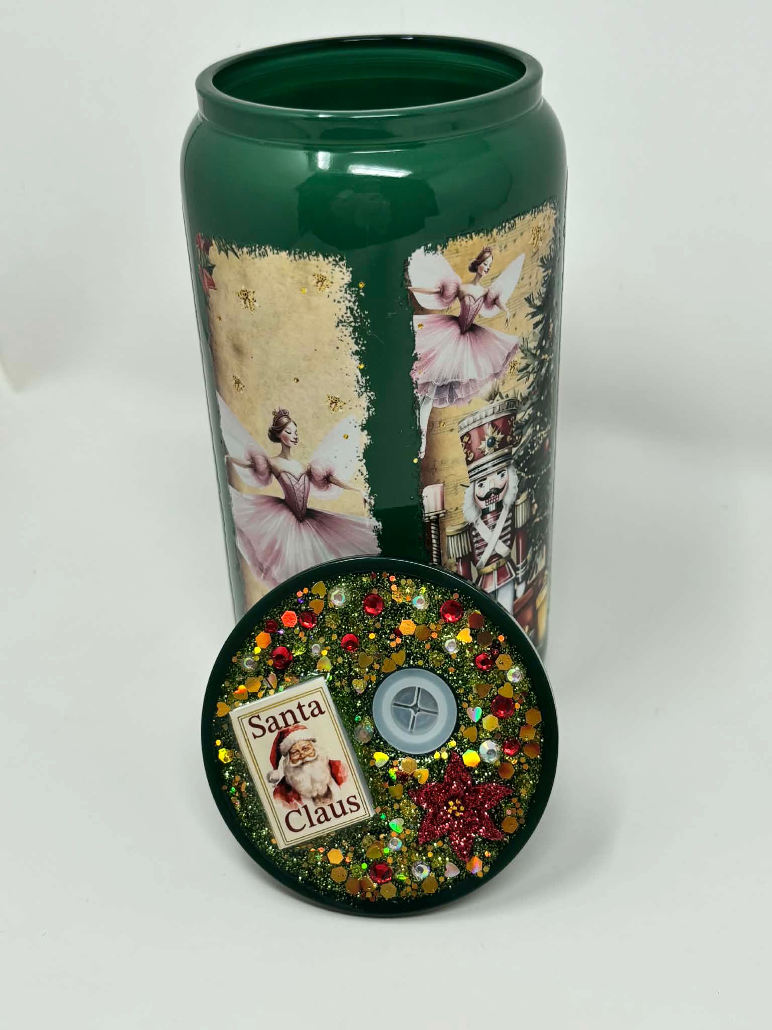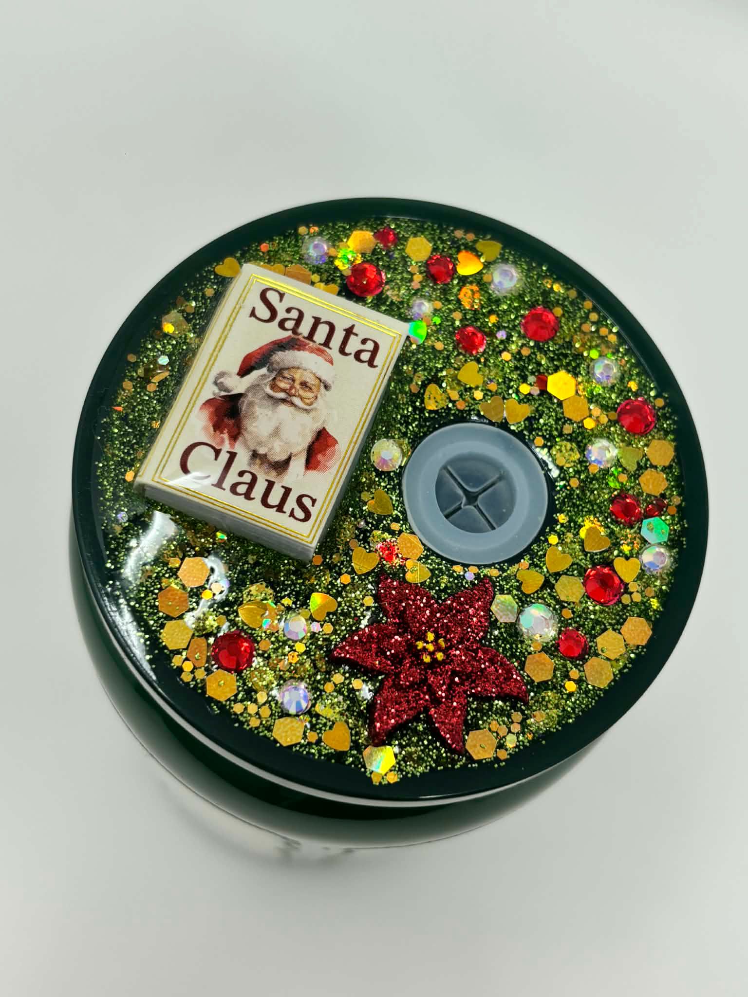The deep green glass adds a rich, elegant tone while the glitter-packed lid dazzles with red rhinestones, gold accents, and a vintage Santa decal. Made to hold both hot cocoa or iced lattes, this tumbler is functional, fabulous, and totally unforgettable.