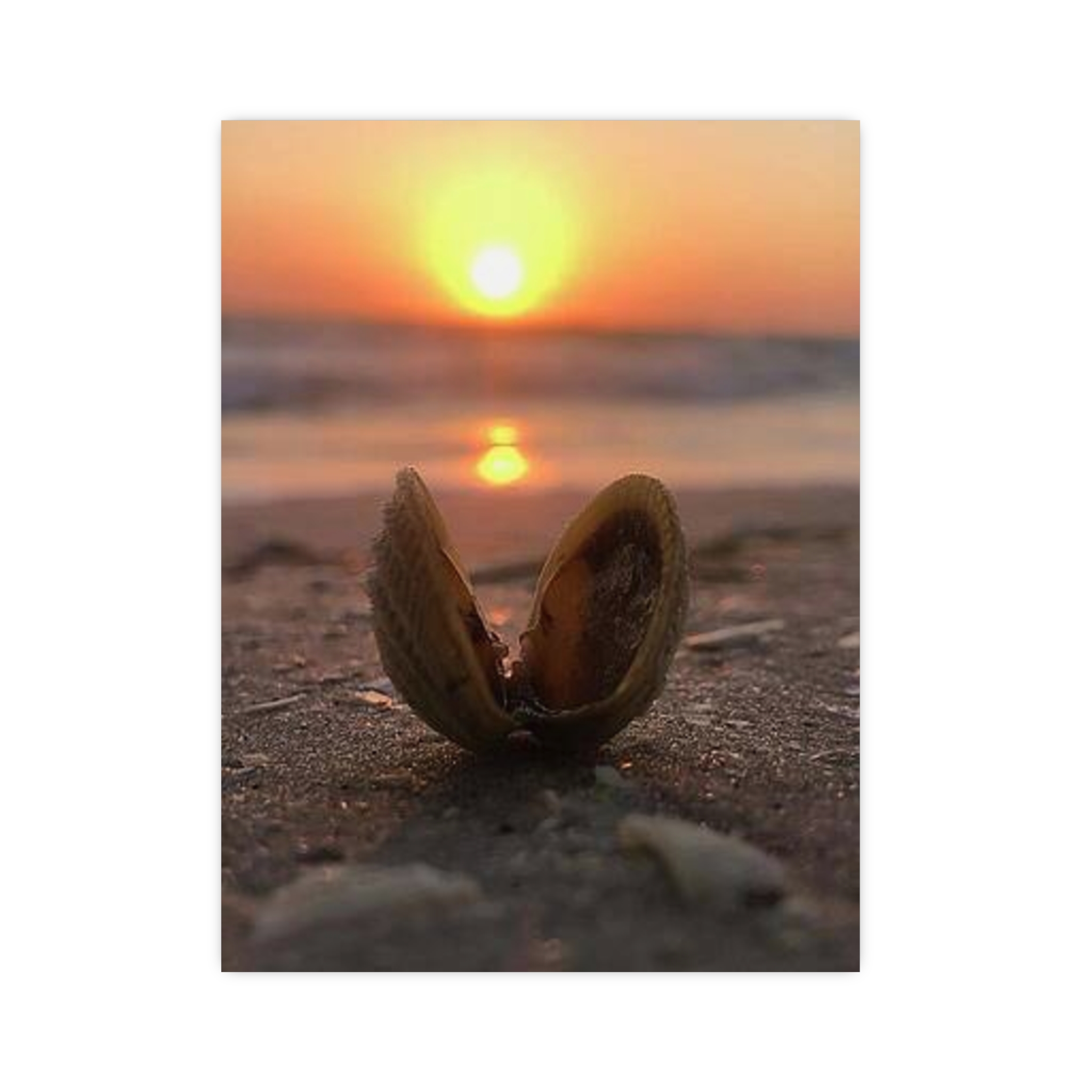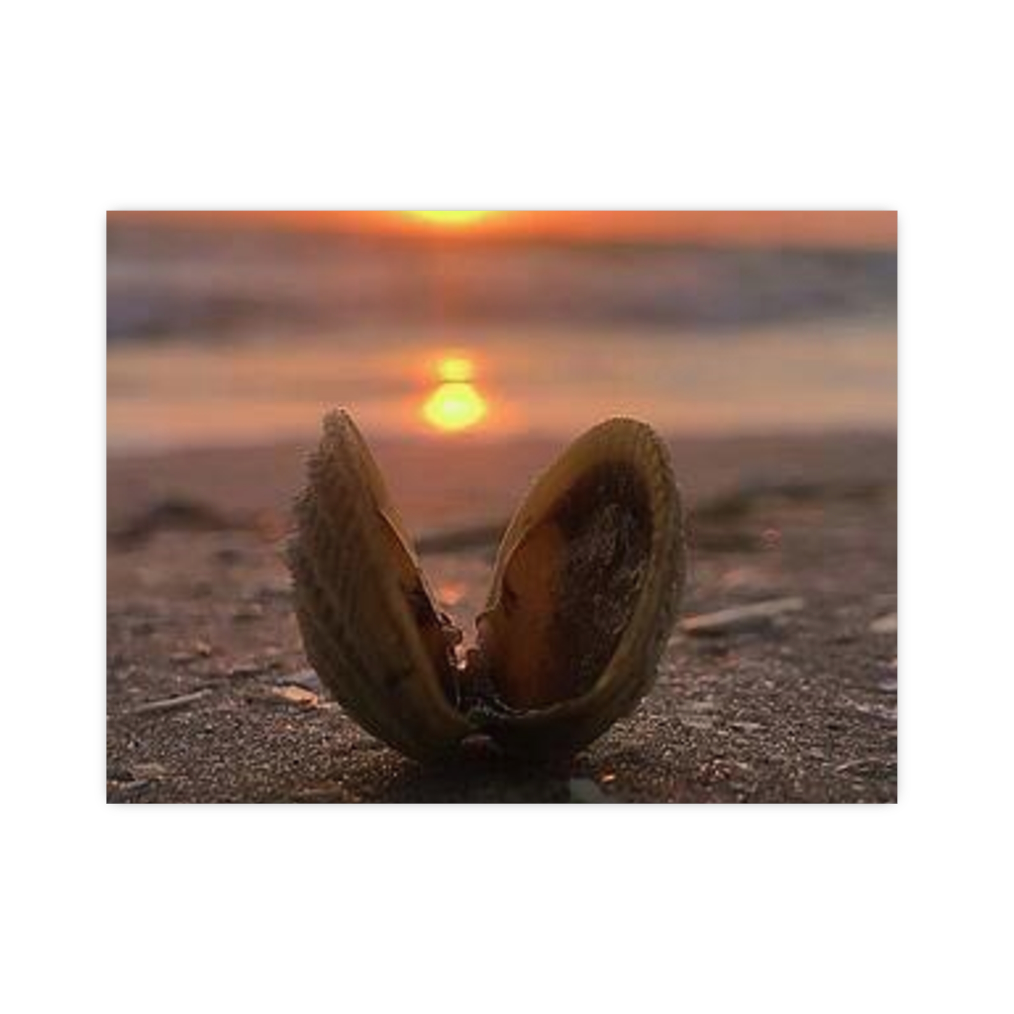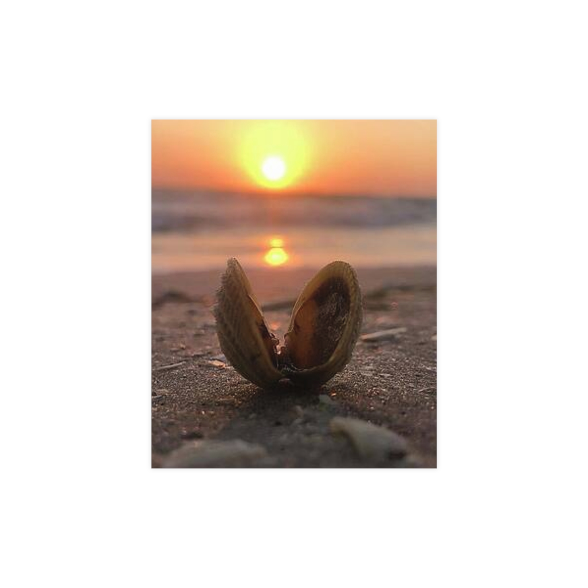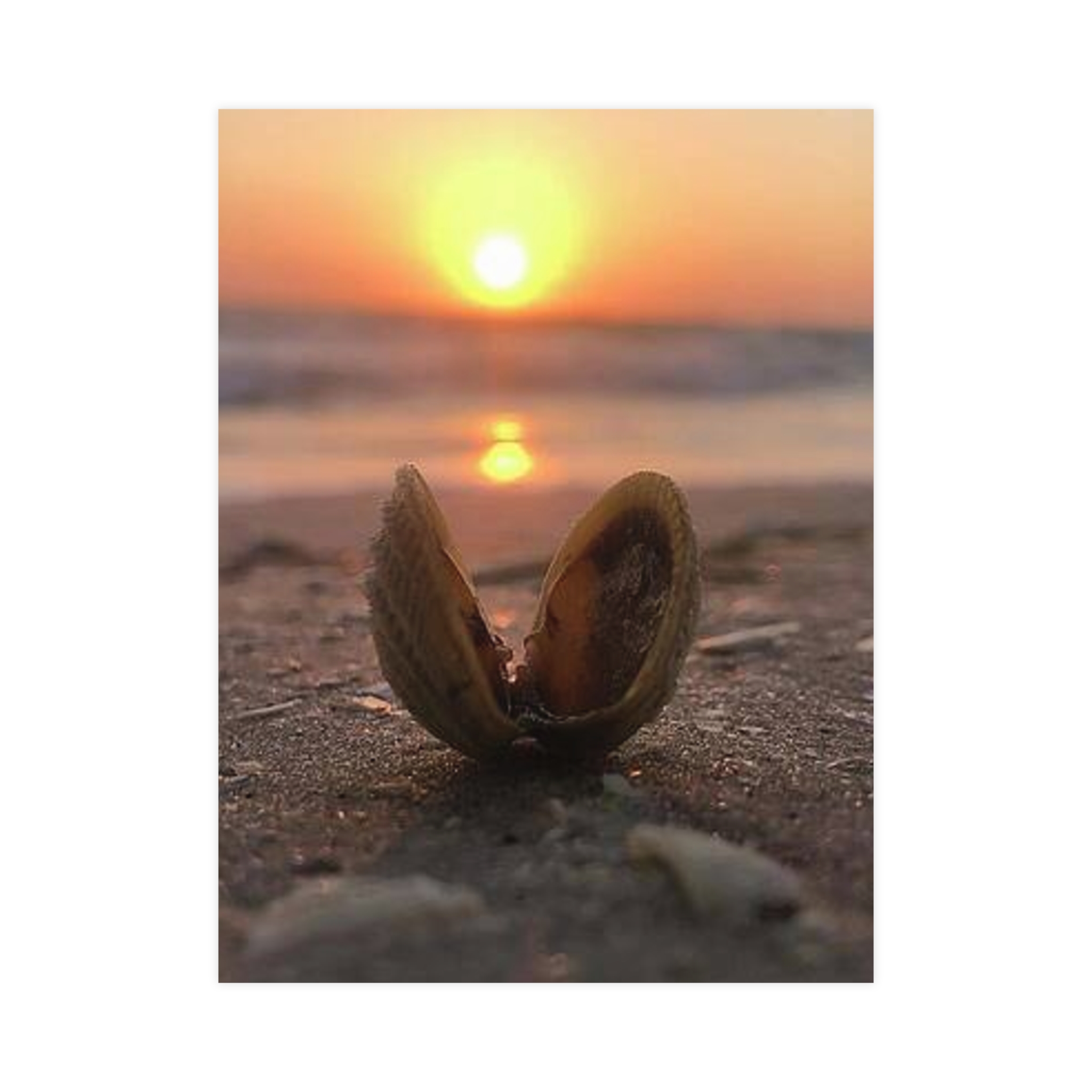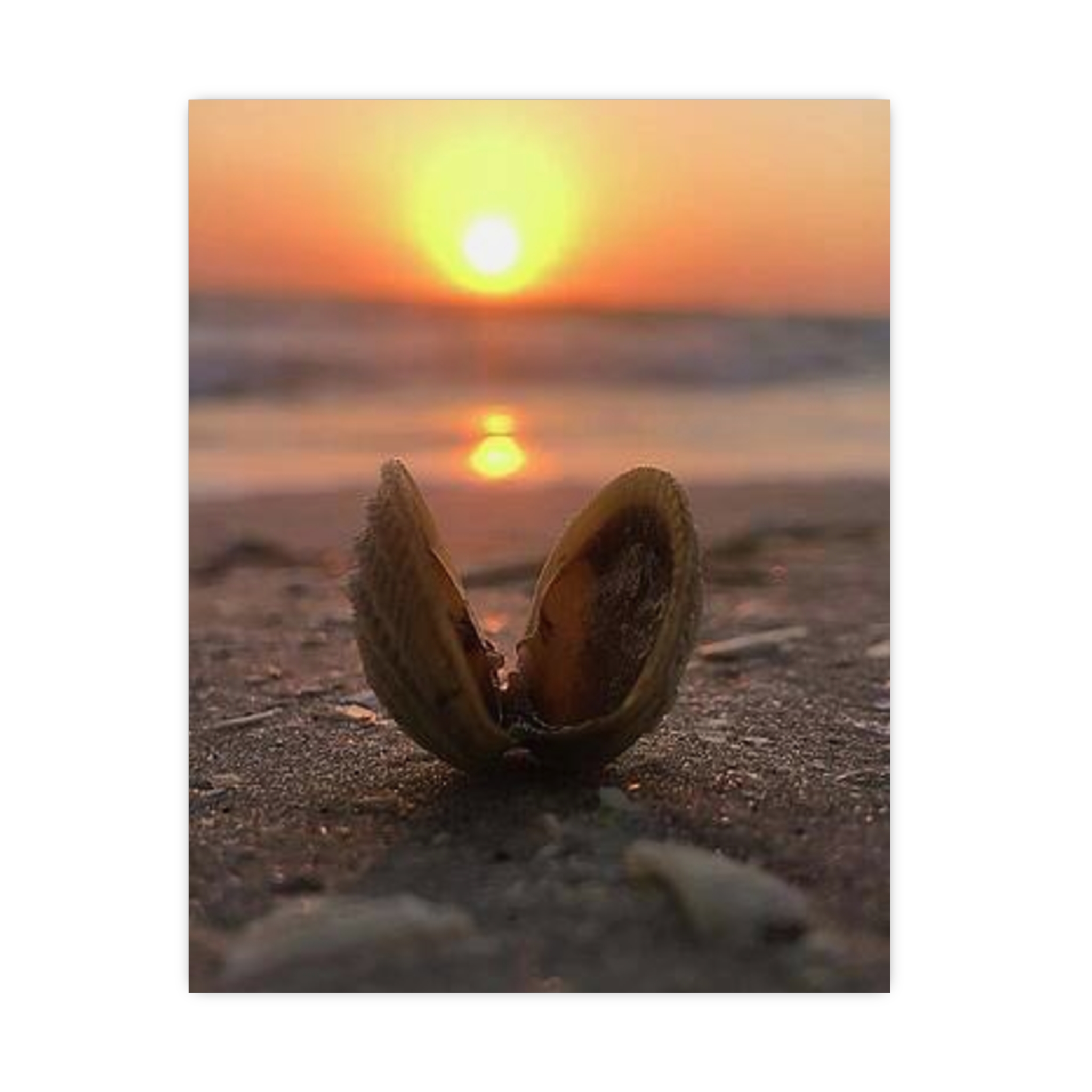 Captured by Hmh Art, Sunrise Treasure celebrates the quiet magic of morning by the shore. A single open shell cradles the first light of day, symbolizing new beginnings, peace, and the beauty found in simple moments. Each print is a reminder to slow down and let nature’s elegance shine through — the kind of calm only a coastal sunrise can bring.