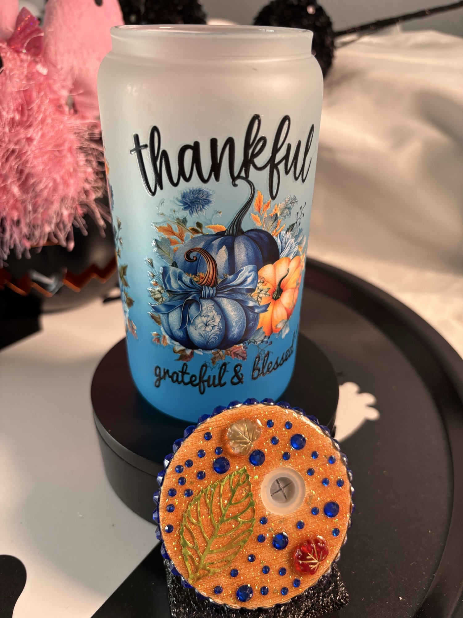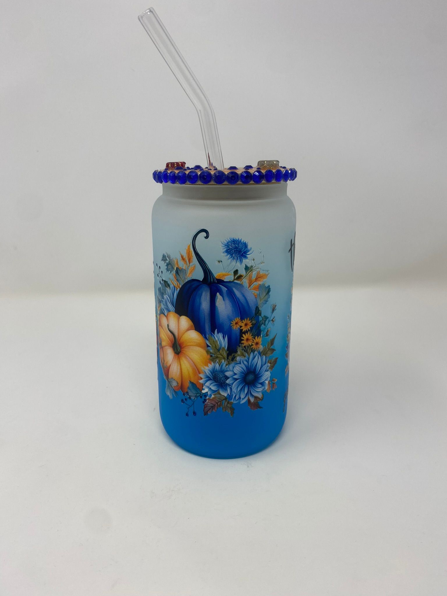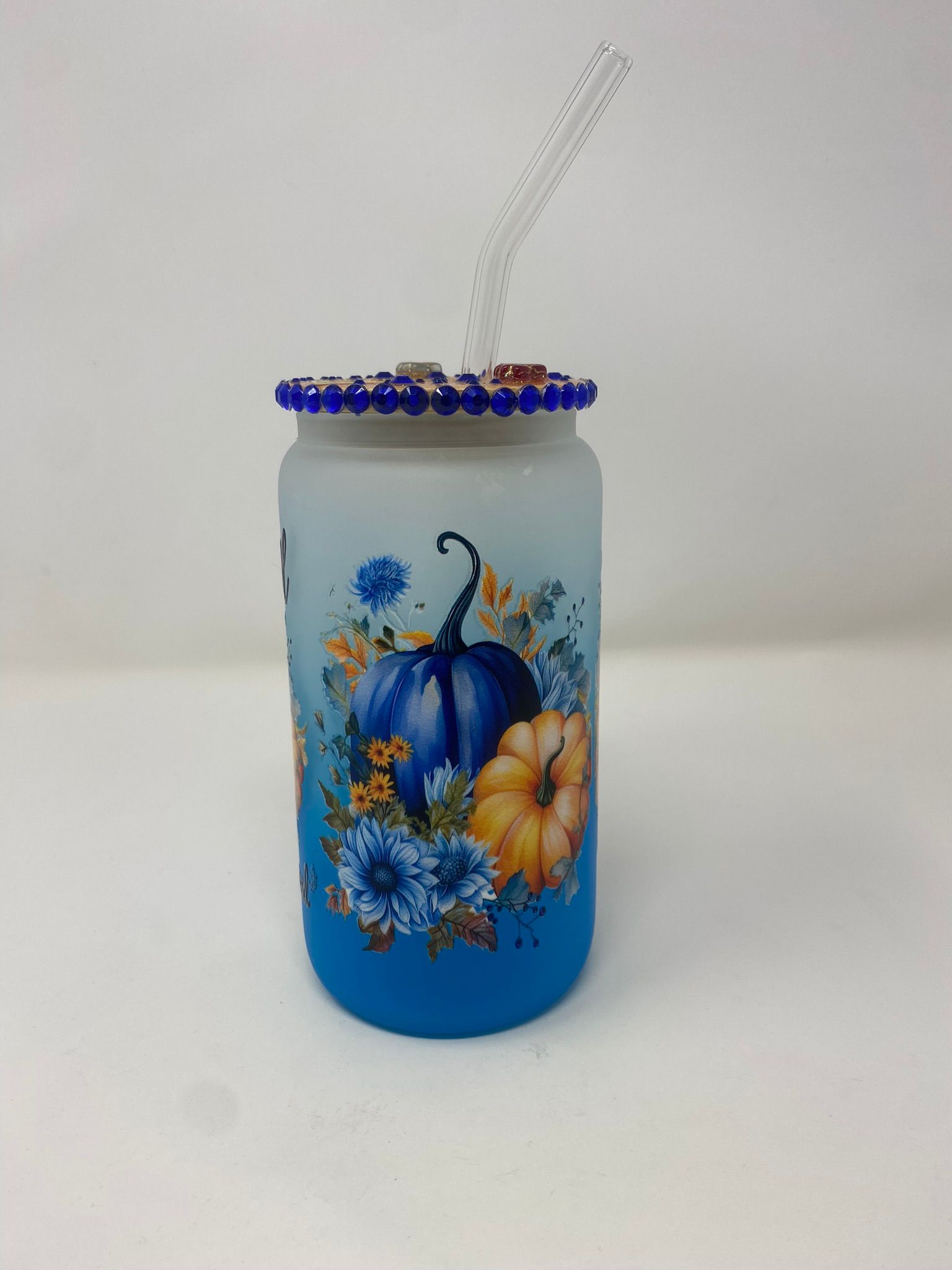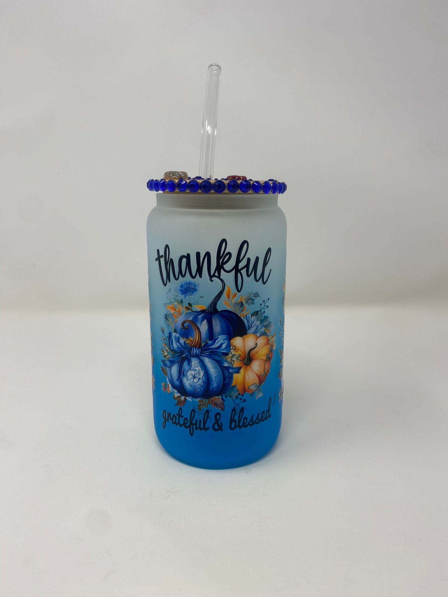 Celebrate the beauty of fall with the Thankful & Blessed tumbler. Featuring a frosted blue ombré finish adorned with elegant pumpkins and autumn florals, this tumbler brings cozy charm and heartfelt gratitude to every sip.