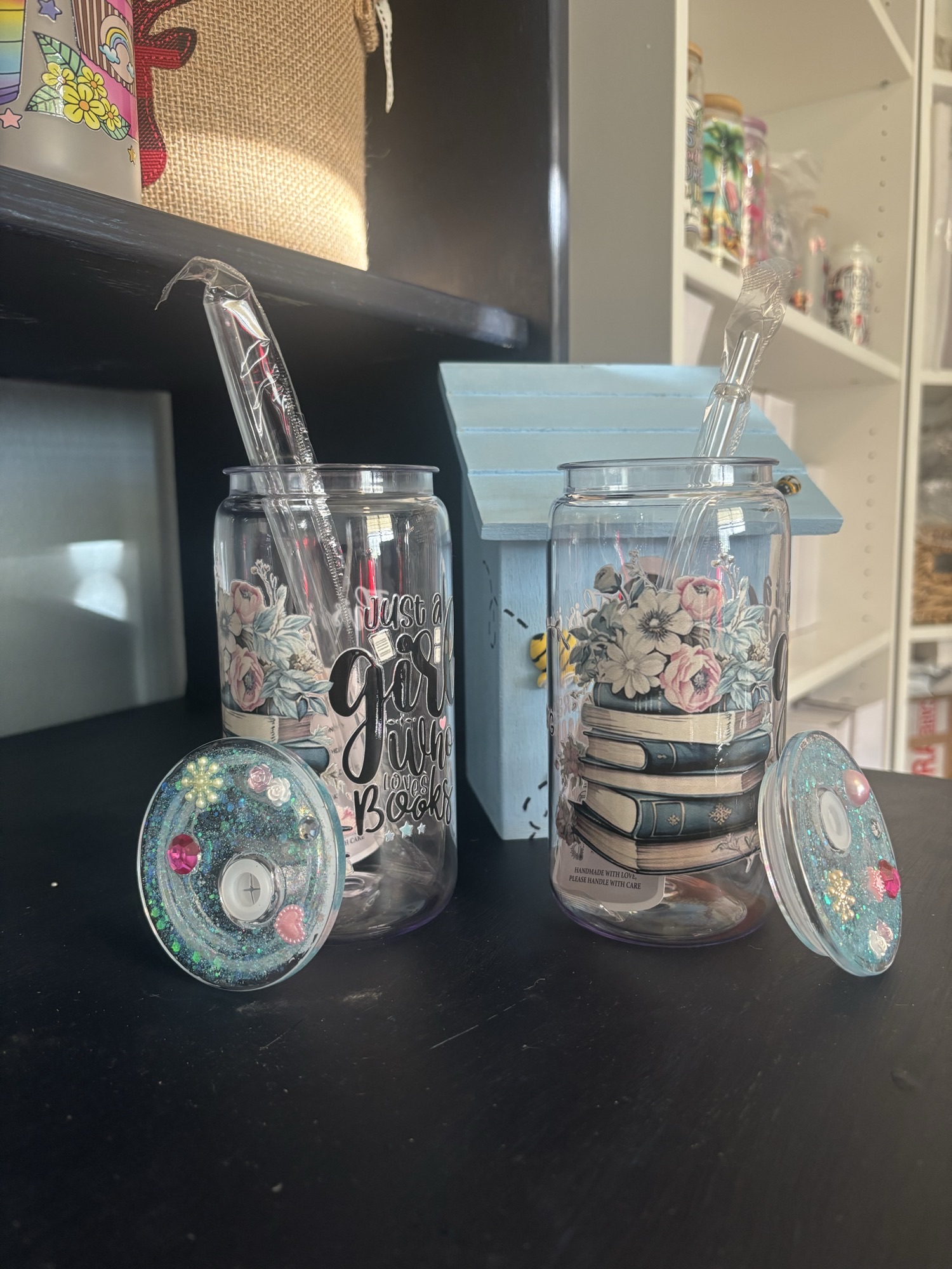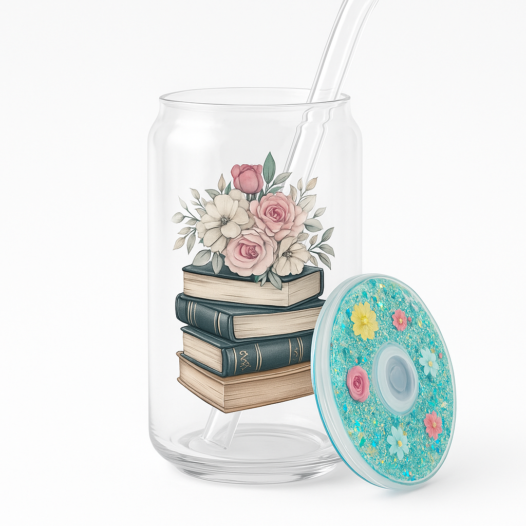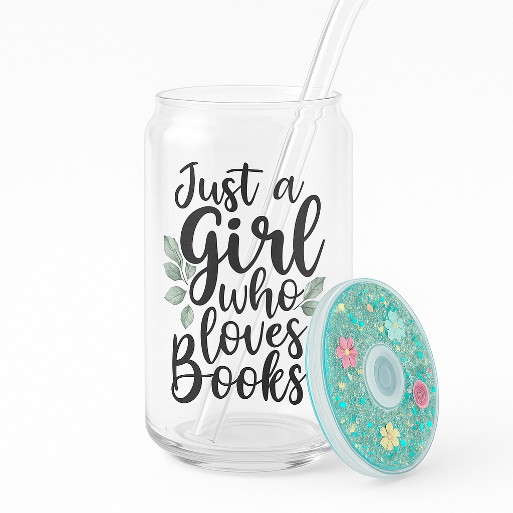 One side reminds you you’re “Just a Girl Who Loves Books,” while the other displays a dreamy stack of vintage books topped with soft watercolor florals. The glittery turquoise lid sparkles with embedded blooms, making it just as whimsical as your favorite read.