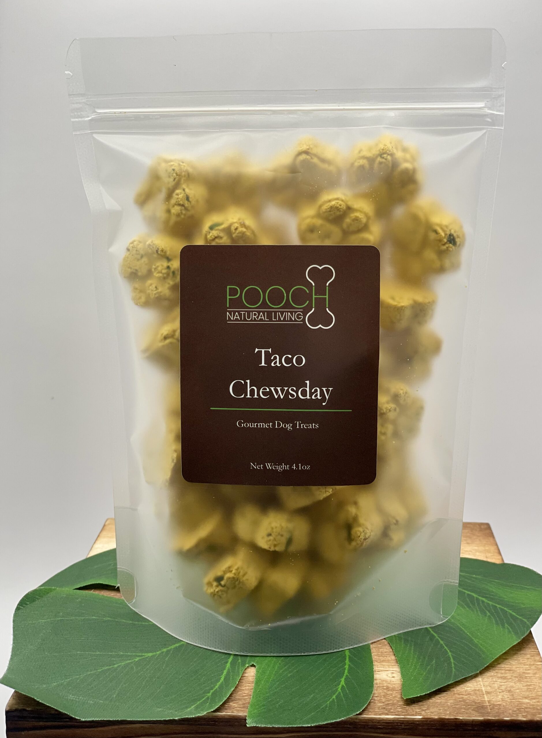Taco Chewsday is about 3/4″ inch sized crunchy treat (60 count) shaped as a paw. These grain free and gluten free dog treats are made of organic ground beef and organic cumin. This treat not only tastes like a beef taco but it has powerful antioxidants, such as organic turmeric, organic parsley, and organic pumpkin.