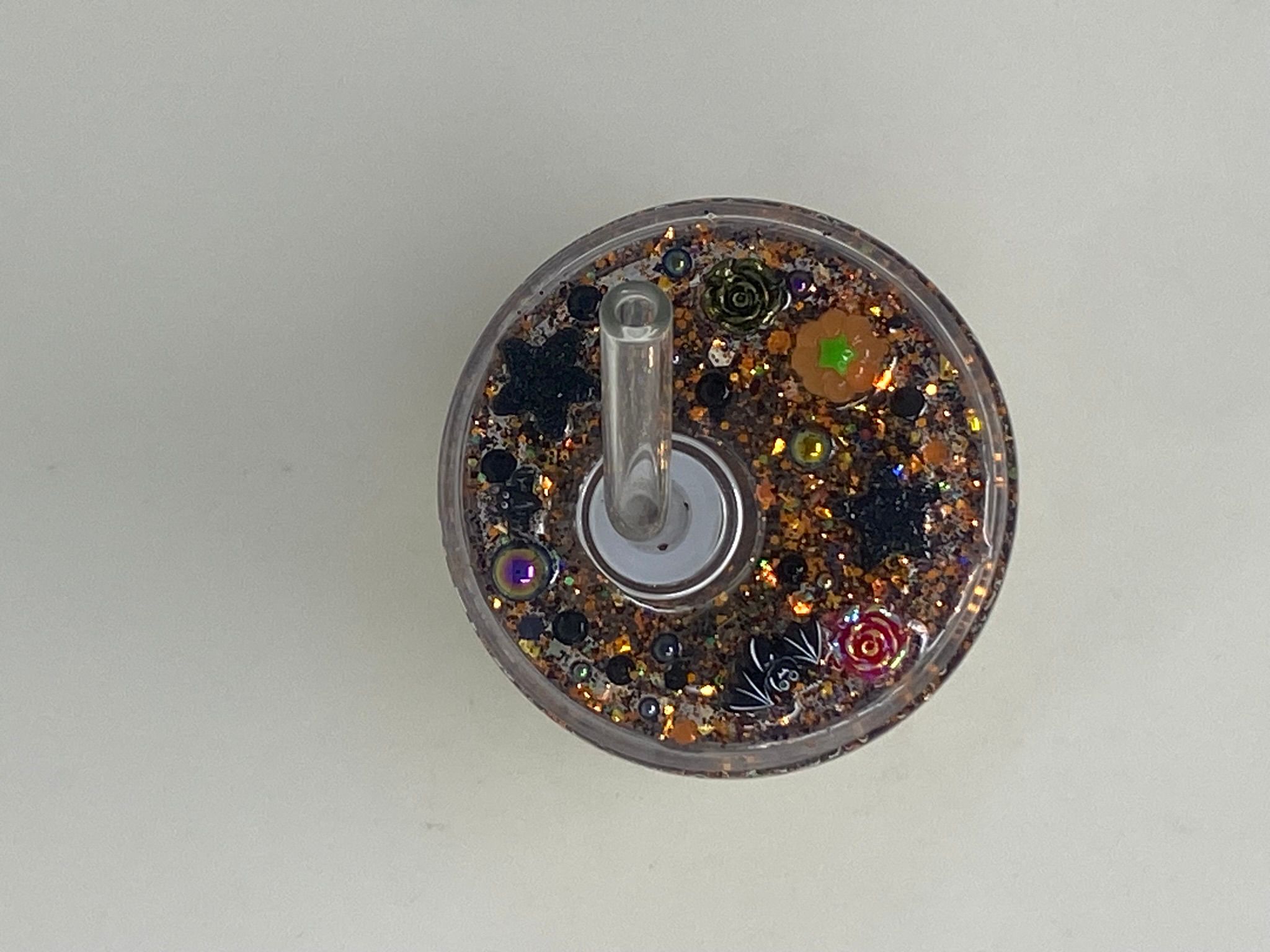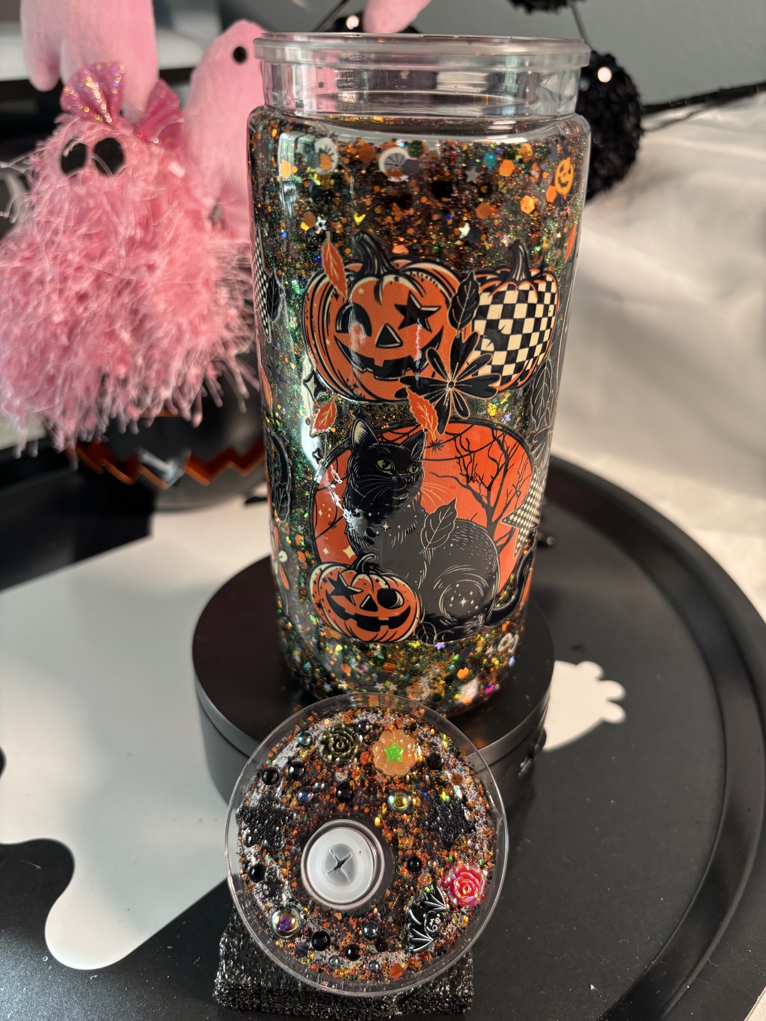 The matching glitter lid is decorated with gothic florals, shimmering gems, and spooky little details, making it the ultimate accessory for any Halloween lover. Whether you’re sipping cider, pumpkin spice, or something a little more magical, this tumbler brings the Halloween vibe to every sip.