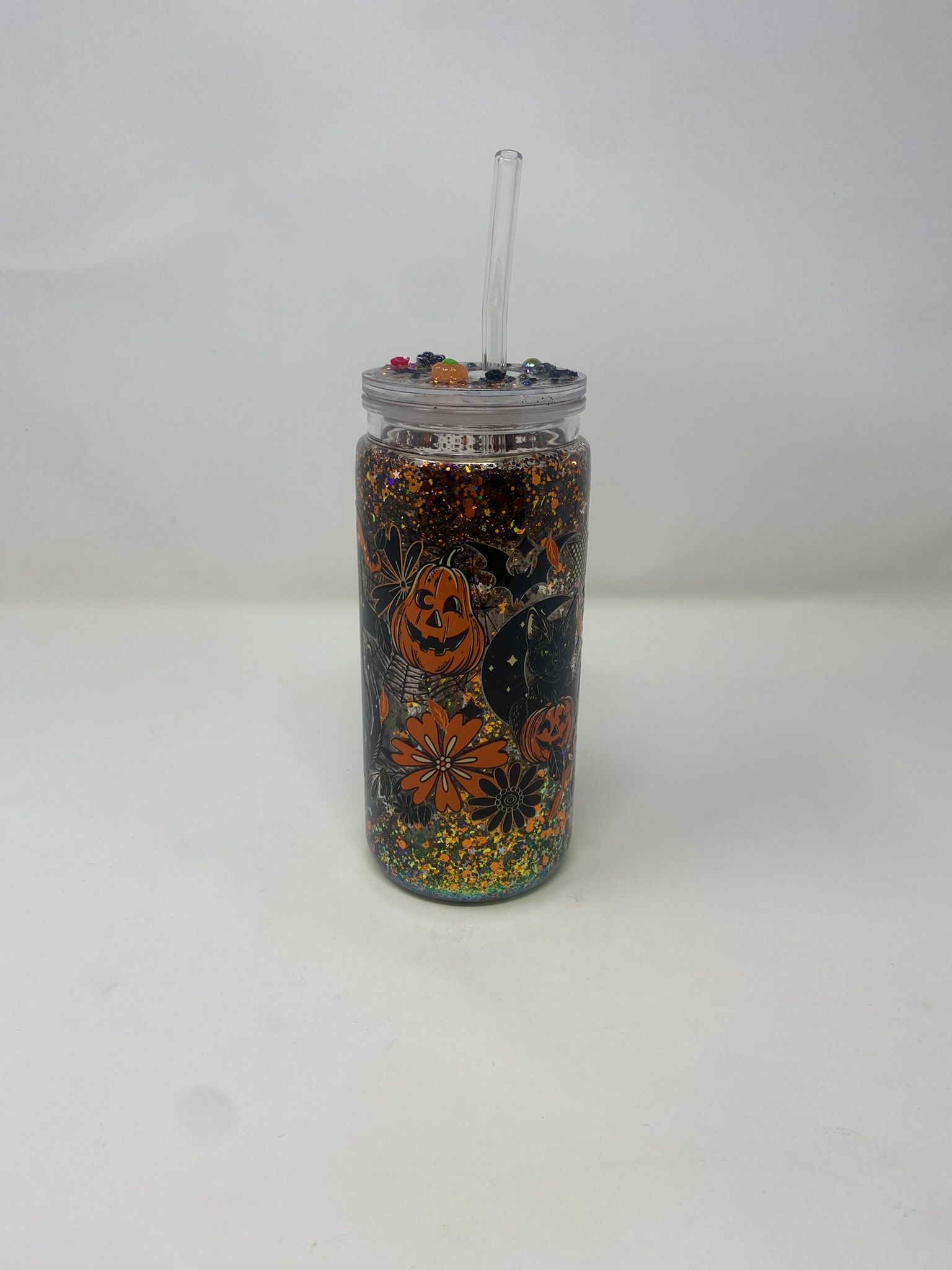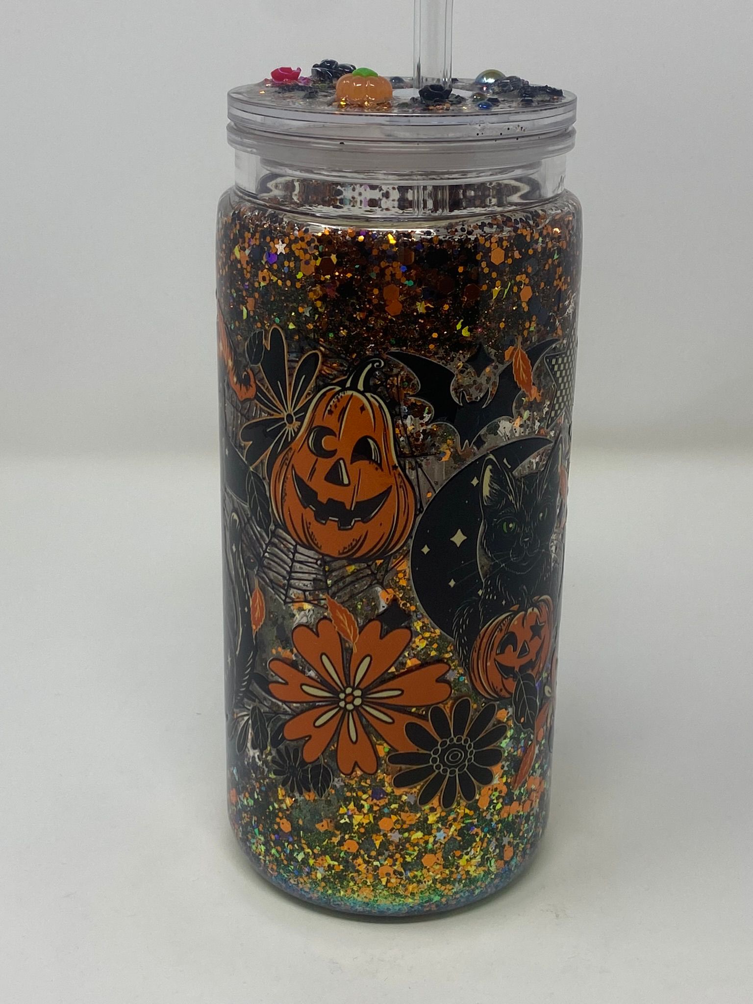 Step into the spirit of Halloween with the Wicked Nights tumbler. Featuring bold jack-o’-lanterns, a mysterious black cat, and playful checkered accents, this tumbler is packed with festive charm. The glitter-filled background sparkles in orange, gold, and green for a bewitching effect that’s impossible to miss.