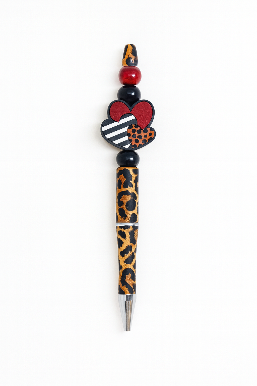 Unleash your inner wild thing with this handmade pen bursting with personality. Featuring a trio of hearts in red, leopard, and stripes, paired with a sassy animal print barrel — it’s made for the ones who write with passion and live unapologetically. Handmade by Willow of Holistic Hippie Vibes in Florida.